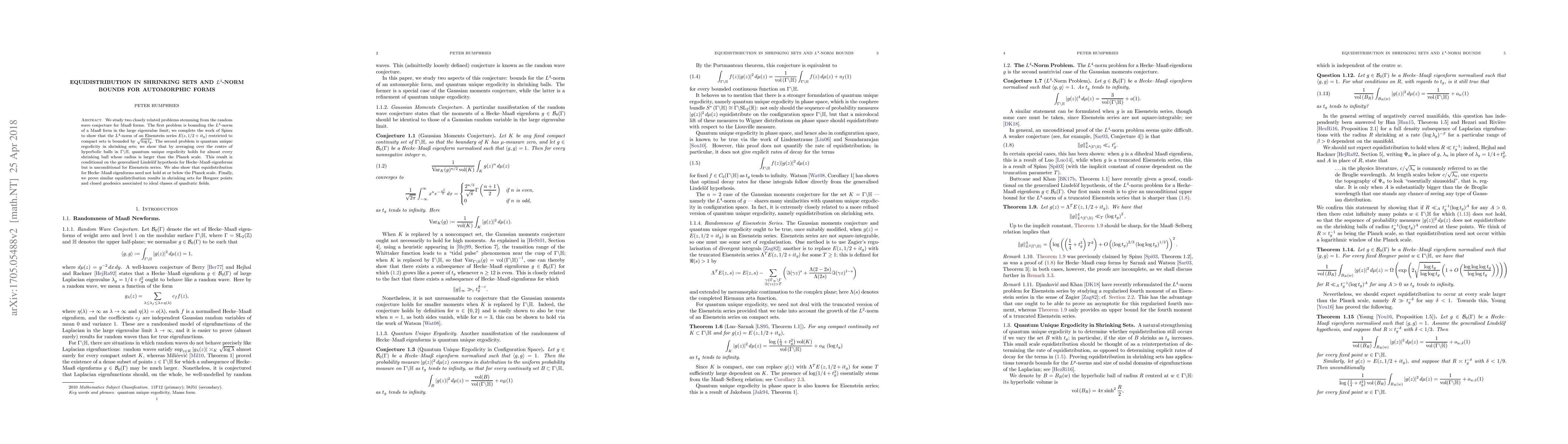 We study two closely related problems stemming from the random wave conjecture for Maass forms. The first problem is bounding the $L^4$-norm of a Maass form in the large eigenvalue limit; we complete the work of Spinu to show that the $L^4$-norm of an Eisenstein series $E(z,1/2+it_g)$ restricted to compact sets is bounded by $\sqrt{\log t_g}$. The second problem is quantum unique ergodicity in shrinking sets; we show that by averaging over the centre of hyperbolic balls in $\Gamma \backslash \mathbb{H}$, quantum unique ergodicity holds for almost every shrinking ball whose radius is larger than the Planck scale. This result is conditional on the generalised Lindelof hypothesis for Maass eigenforms but is unconditional for Eisenstein series. We also show that equidistribution for Maass eigenforms need not hold at or below the Planck scale. Finally, we prove similar equidistribution results in shrinking sets for Heegner points and closed geodesics associated to ideal classes of quadratic fields.