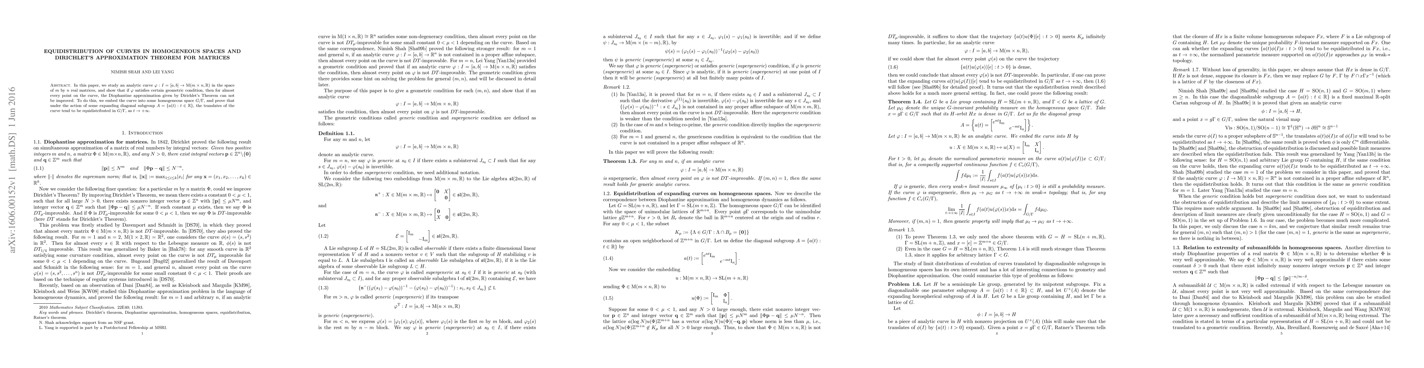 This paper investigates an analytic curve in the space of real matrices, showing that under certain geometric conditions, the curve's translates under an expanding diagonal subgroup become equidistributed in a homogeneous space. It concludes that Dirichlet's approximation theorem cannot be improved for almost every point on the curve.