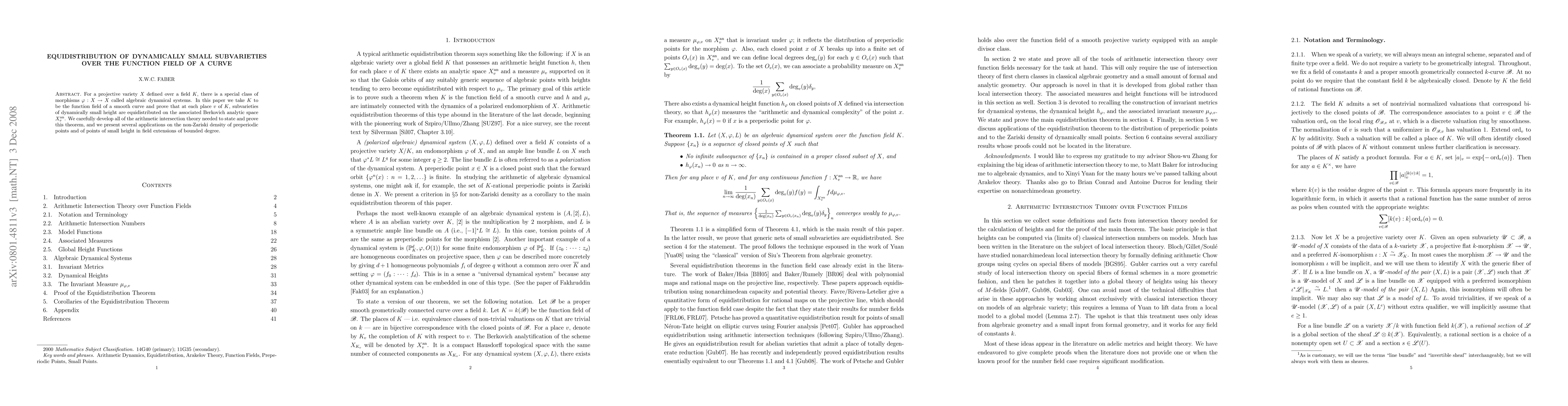 For a projective variety X defined over a field K, there is a special class of self-morphisms of X called algebraic dynamical systems. In this paper we take K to be the function field of a smooth curve and prove that at each place of K, subvarieties of X of dynamically small height are equidistributed on the associated Berkovich analytic space. We carefully develop all of the arithmetic intersection theory needed to state and prove this theorem, and we present several applications on the non-Zariski density of preperiodic points and of points of small height in field extensions of bounded degree.