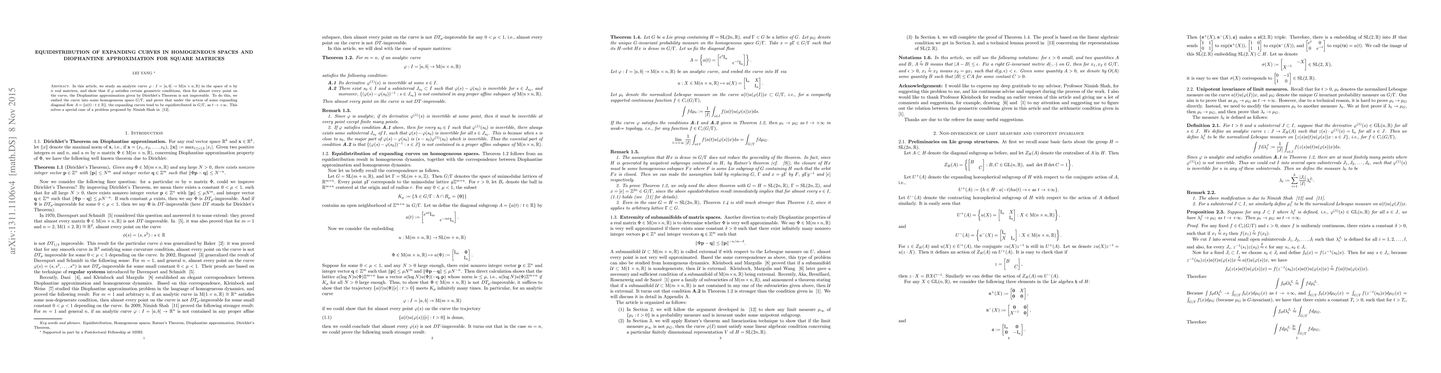 This paper investigates an analytic curve in the space of real matrices and demonstrates that under specific geometric conditions, the Diophantine approximation along the curve cannot be improved. It proves the equidistribution of expanding curves in homogeneous spaces under an expanding diagonal flow, solving a problem posed by Nimish Shah.