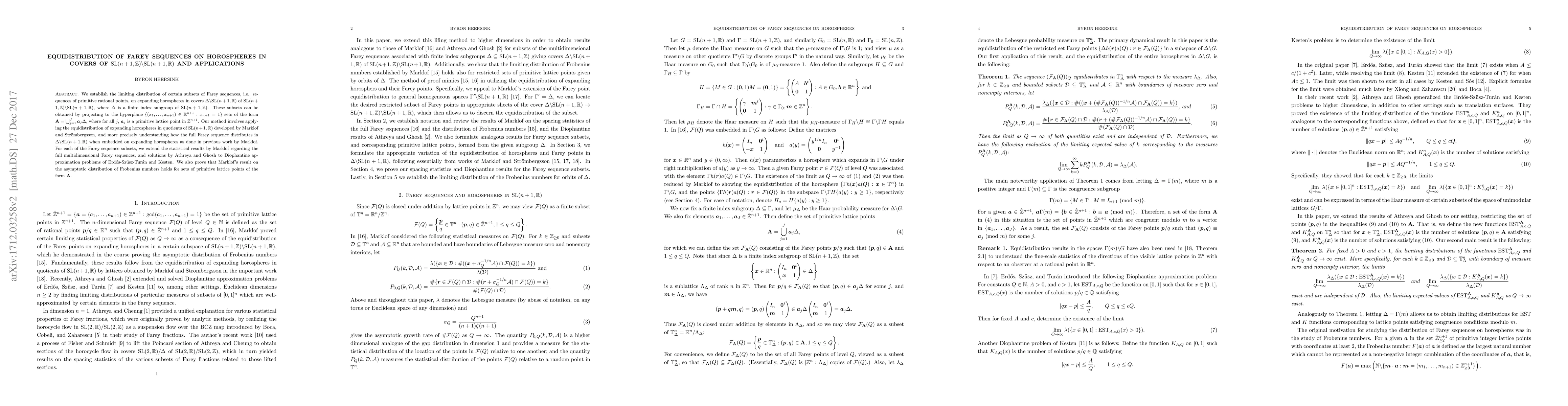 We establish the limiting distribution of certain subsets of Farey sequences, i.e., sequences of primitive rational points, on expanding horospheres in covers $\Delta\backslash\mathrm{SL}(n+1,\mathbb{R})$ of $\mathrm{SL}(n+1,\mathbb{Z})\backslash\mathrm{SL}(n+1,\mathbb{R})$, where $\Delta$ is a finite index subgroup of $\mathrm{SL}(n+1,\mathbb{Z})$. These subsets can be obtained by projecting to the hyperplane $\{(x_1,\ldots,x_{n+1})\in\mathbb{R}^{n+1}:x_{n+1}=1\}$ sets of the form $\mathbf{A}=\bigcup_{j=1}^J\boldsymbol{a}_j\Delta$, where for all $j$, $\boldsymbol{a}_j$ is a primitive lattice point in $\mathbb{Z}^{n+1}$. Our method involves applying the equidistribution of expanding horospheres in quotients of $\mathrm{SL}(n+1,\mathbb{R})$ developed by Marklof and Str\"{o}mbergsson, and more precisely understanding how the full Farey sequence distributes in $\Delta\backslash\mathrm{SL}(n+1,\mathbb{R})$ when embedded on expanding horospheres as done in previous work by Marklof. For each of the Farey sequence subsets, we extend the statistical results by Marklof regarding the full multidimensional Farey sequences, and solutions by Athreya and Ghosh to Diophantine approximation problems of Erd\H{o}s-Sz\"{u}sz-Tur\'an and Kesten. We also prove that Marklof's result on the asymptotic distribution of Frobenius numbers holds for sets of primitive lattice points of the form $\mathbf{A}$.