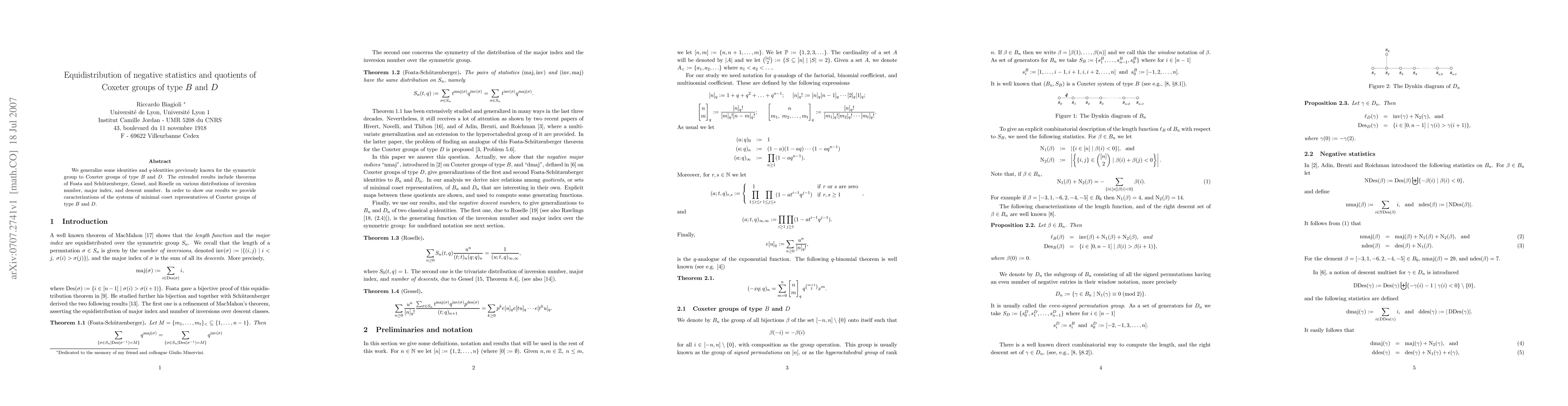 We generalize some identities and q-identities previously known for the symmetric group to Coxeter groups of type B and D. The extended results include theorems of Foata and Sch\"utzenberger, Gessel, and Roselle on various distributions of inversion number, major index, and descent number. In order to show our results we provide caracterizations of the systems of minimal coset representatives of Coxeter groups of type B and D.