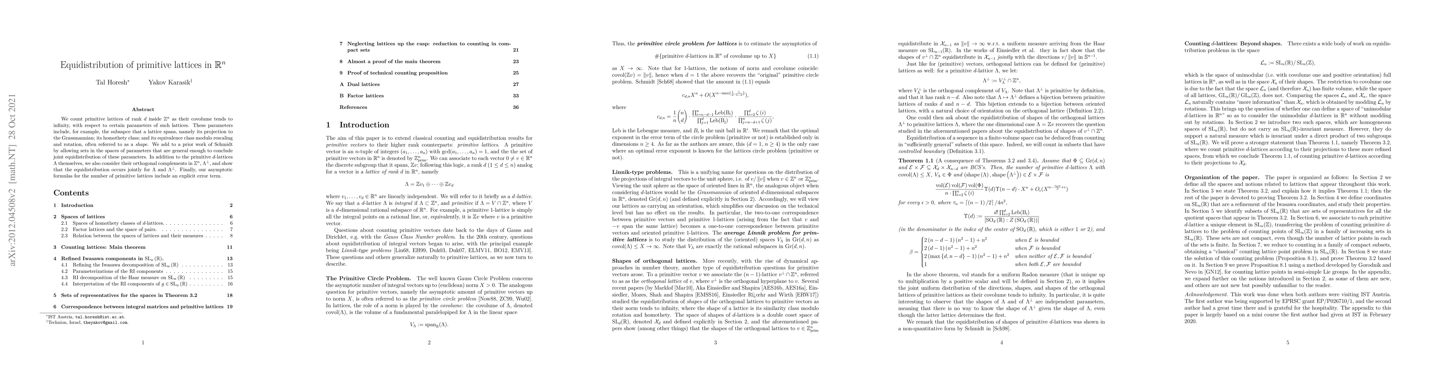 We count primitive lattices of rank $d$ inside $\mathbb{Z}^{n}$ as their covolume tends to infinity, with respect to certain parameters of such lattices. These parameters include, for example, the subsapce that a lattice spans, namely its projection to the Grassmannian; its homothety class; and its equivalence class modulo rescaling and rotation, often referred to as a shape. We add to a prior work of Schmidt by allowing sets in the spaces of parameters that are general enough to conclude joint equidistribution of these parameters. In addition to the primitive $d$-lattices themselves, we also consider their orthogonal complements in $\mathbb{Z}^{n}$, and show that the equidistribution occurs jointly for primitive lattices and their orthogonal complements. Finally, our asymptotic formulas for the number of primitive lattices include an explicit error term.