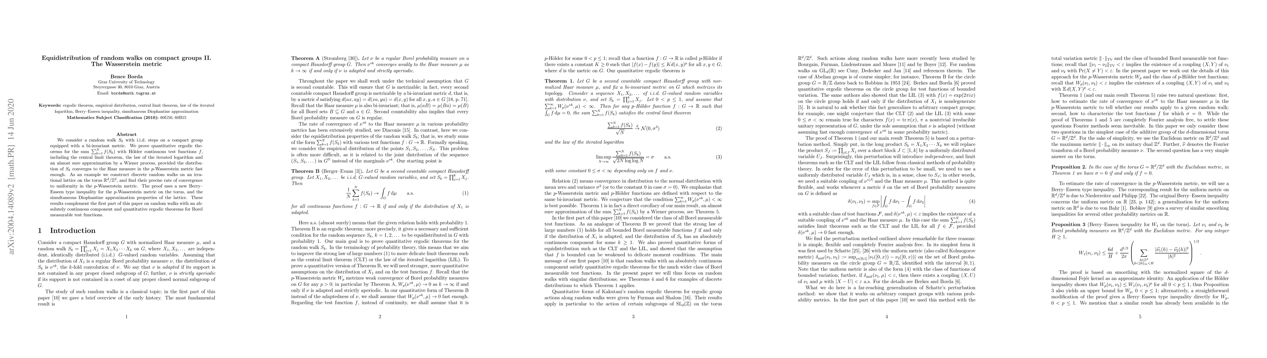 This paper proves quantitative ergodic theorems for random walks on compact groups, including a central limit theorem and the law of the iterated logarithm, under conditions on the convergence of the distribution to the Haar measure in the $p$-Wasserstein metric. It also constructs and analyzes discrete random walks on irrational lattices on the torus, determining their precise rate of convergence to uniformity.
