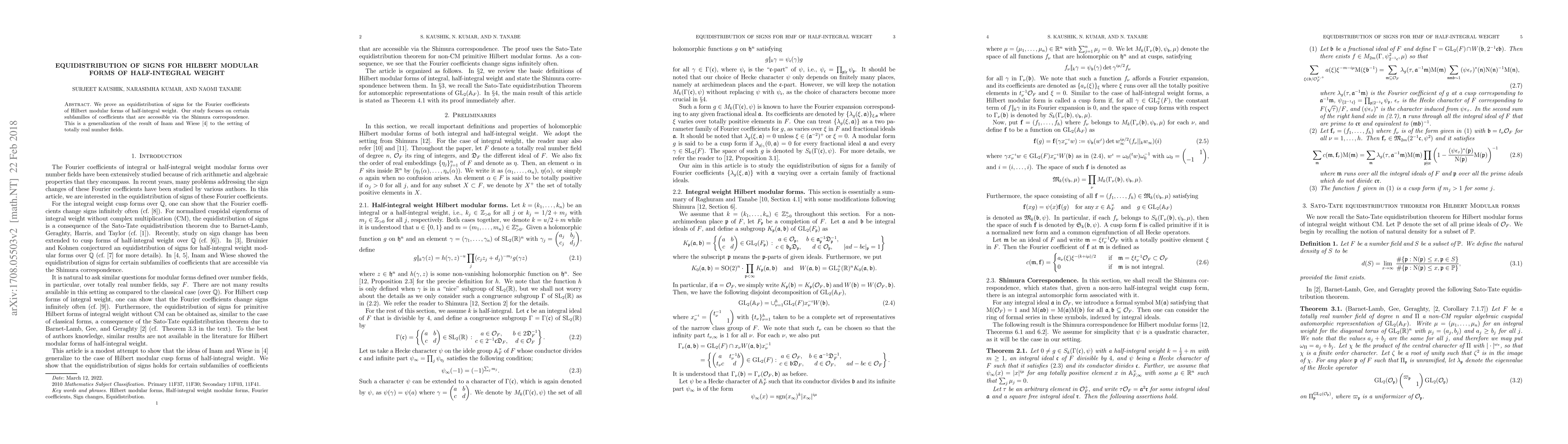 We prove an equidistribution of signs for the Fourier coefficients of Hilbert modular forms of half-integral weight. Our study focuses on certain subfamilies of coefficients that are accessible via the Shimura correspondence. This is a generalization of the result of Inam and Wiese to the setting of totally real number fields