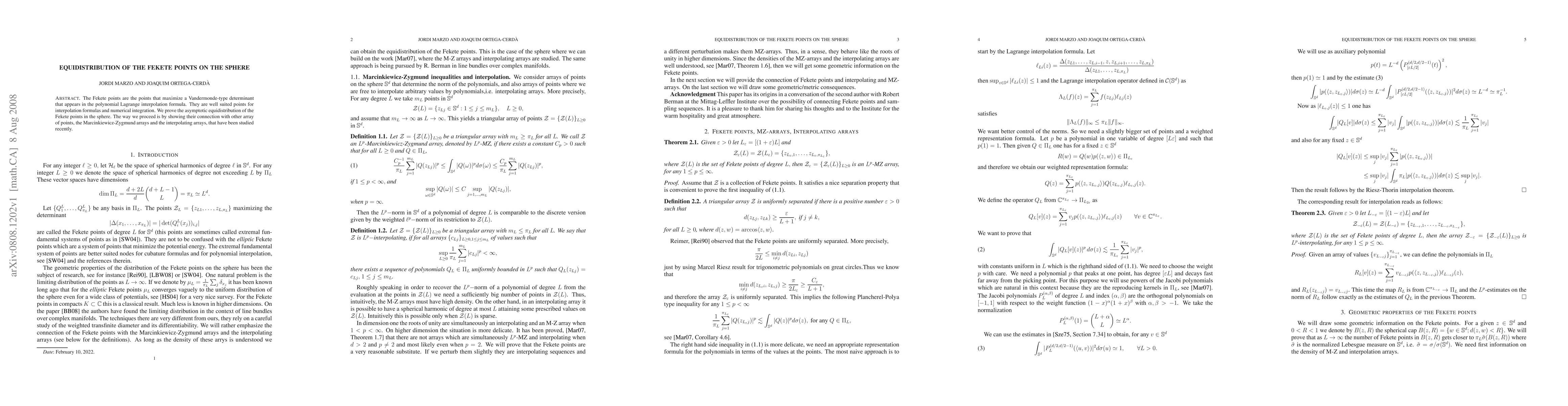 Summary: This paper demonstrates the asymptotic equidistribution of Fekete points on a sphere, which are optimal for polynomial interpolation and numerical integration. The proof leverages their connection to the recently studied Marcinkiewicz-Zygmund and interpolating arrays.