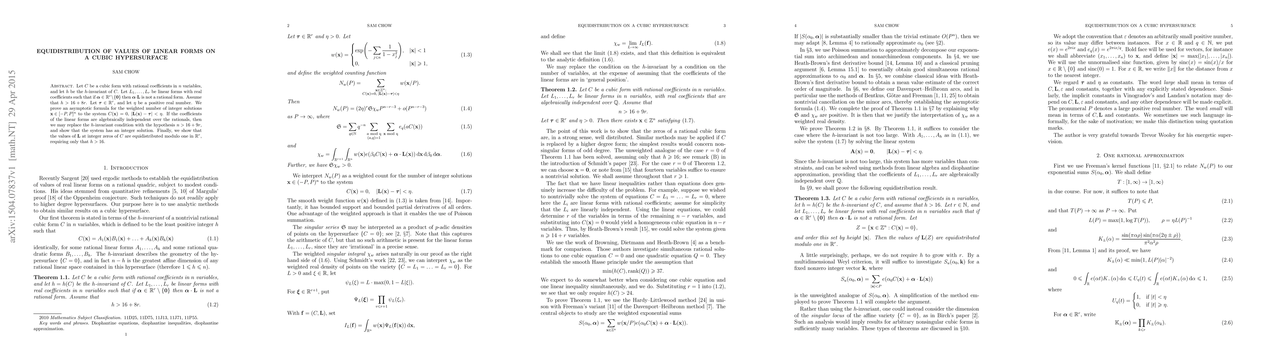 Let $C$ be a cubic form with rational coefficients in $n$ variables, and let $h$ be the $h$-invariant of $C$. Let $L_1, \ldots, L_r$ be linear forms with real coefficients such that if $\boldsymbol{\alpha} \in \mathbb{R}^r \setminus \{ \boldsymbol{0} \}$ then $\boldsymbol{\alpha} \cdot \mathbf{L}$ is not a rational form. Assume that $h > 16 + 8 r$. Let $\boldsymbol{\tau} \in \mathbb{R}^r$, and let $\eta$ be a positive real number. We prove an asymptotic formula for the weighted number of integer solutions $\mathbf{x} \in [-P,P]^n$ to the system $C(\mathbf{x}) = 0, \: |\mathbf{L}(\mathbf{x}) - \boldsymbol{\tau}| < \eta$. If the coefficients of the linear forms are algebraically independent over the rationals, then we may replace the $h$-invariant condition with the hypothesis $n > 16 + 9 r$, and show that the system has an integer solution. Finally, we show that the values of $\mathbf{L}$ at integer zeros of $C$ are equidistributed modulo one in $\mathbb{R}^r$, requiring only that $h > 16$.