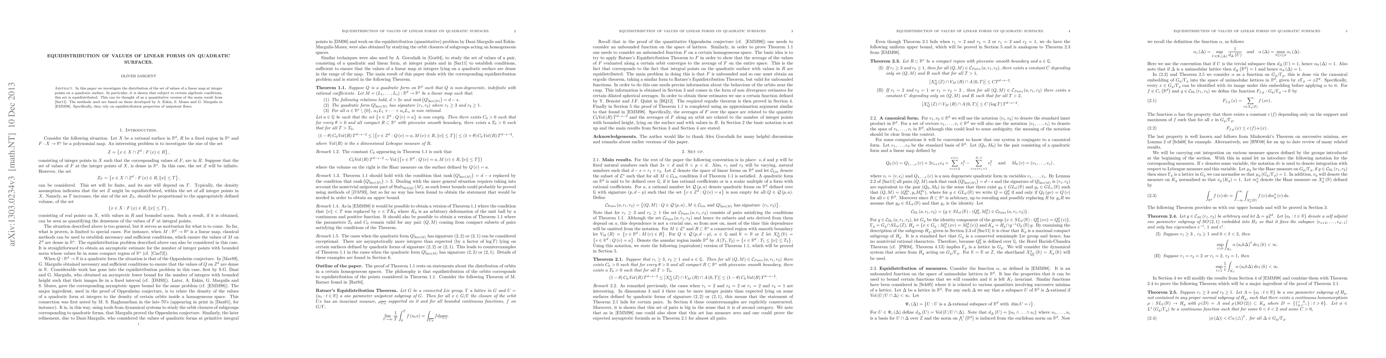 A quadratic surface's values of linear forms at integer points are shown to be equidistributed under certain algebraic conditions, building on previous work on unipotent flows.