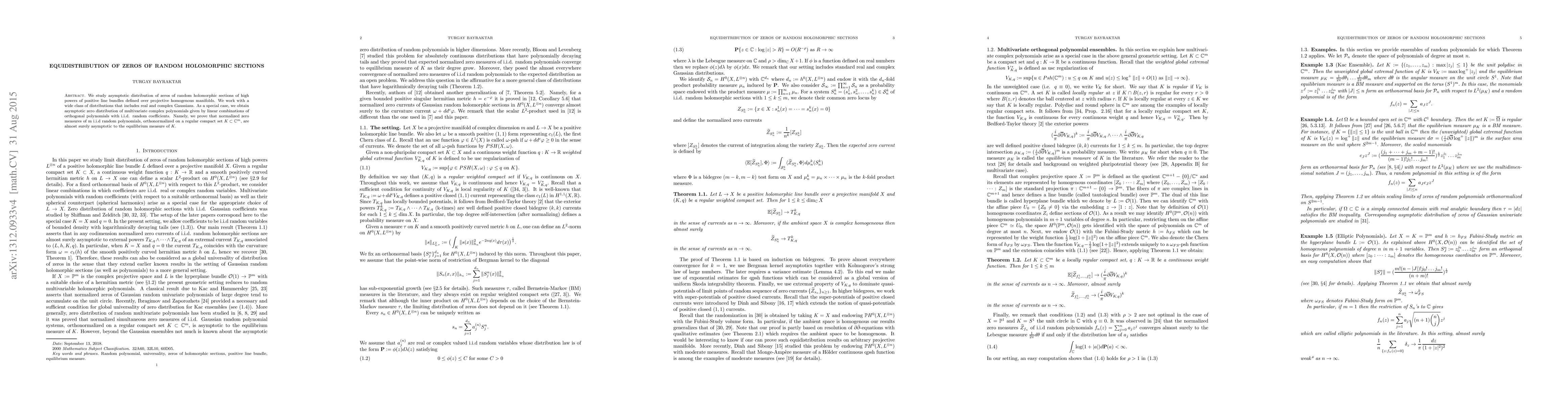 We study asymptotic distribution of zeros of random holomorphic sections of high powers of positive line bundles defined over projective homogenous manifolds. We work with a wide class of distributions that includes real and complex Gaussians. As a special case, we obtain asymptotic zero distribution of multivariate complex polynomials given by linear combinations of orthogonal polynomials with i.i.d. random coefficients. Namely, we prove that normalized zero measures of m i.i.d random polynomials, orthonormalized on a regular compact set $K\subset \Bbb{C}^m,$ are almost surely asymptotic to the equilibrium measure of $K$.