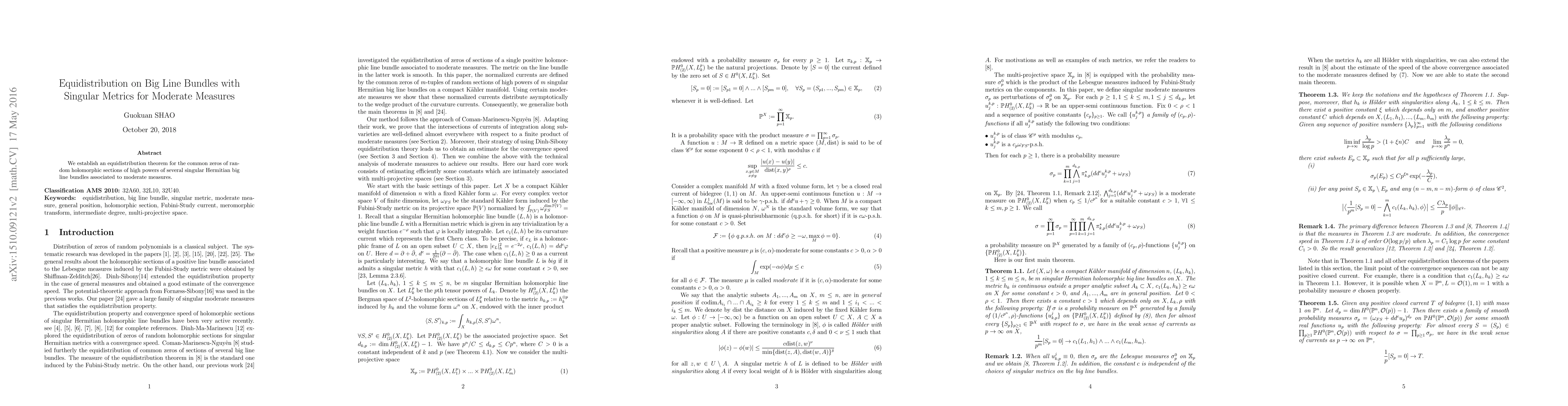 This paper proves an equidistribution theorem for the common zeros of random sections of high powers of singular Hermitian big line bundles tied to moderate measures. The study highlights the behavior of these zeros as the powers increase.