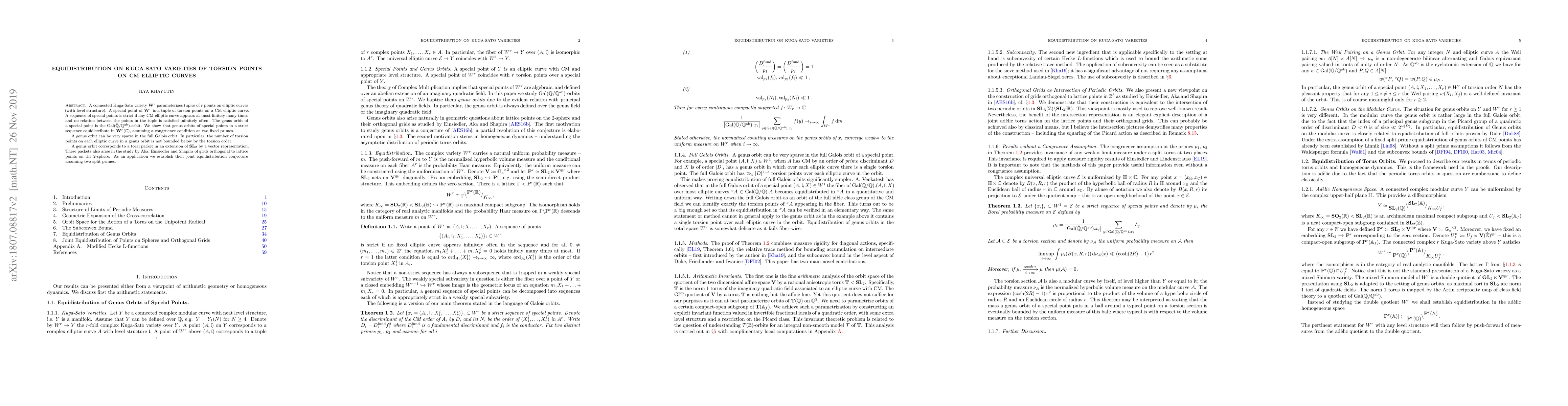 This paper demonstrates the equidistribution of genus orbits of special points in Kuga-Sato varieties of torsion points on CM elliptic curves, assuming certain congruence conditions. It also establishes the joint equidistribution conjecture for toral packets in extensions of $\mathbf{SL}_2$ by vector representations.