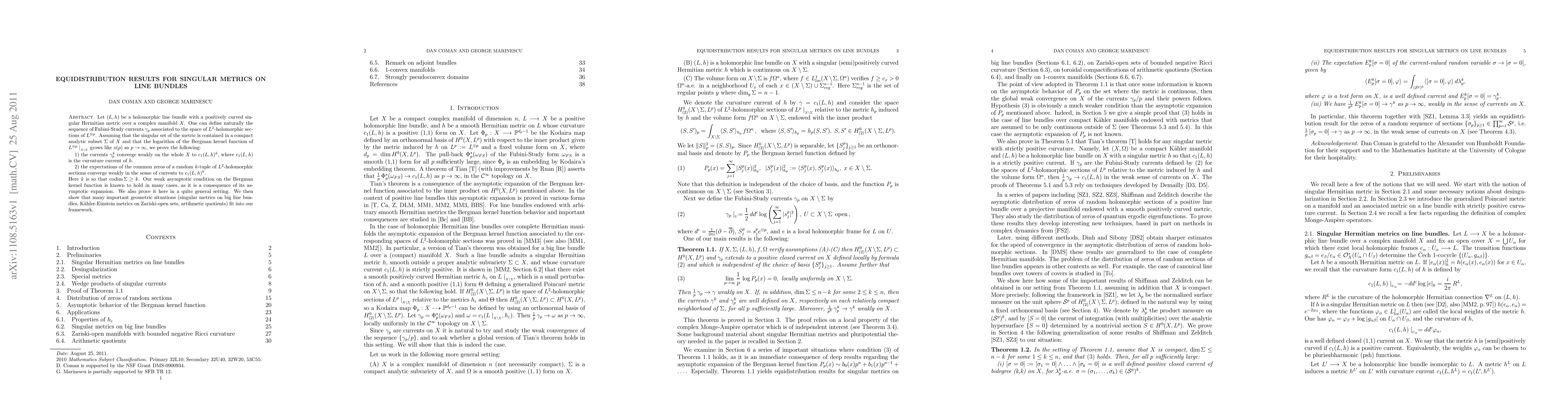 The paper proves the equidistribution of Fubini-Study currents associated with tensor powers of a holomorphic line bundle equipped with a positively curved singular Hermitian metric over a complex manifold, demonstrating their convergence to the curvature current of the line bundle. It also extends these results to random common zeros of sections and verifies applicability in various geometric contexts.