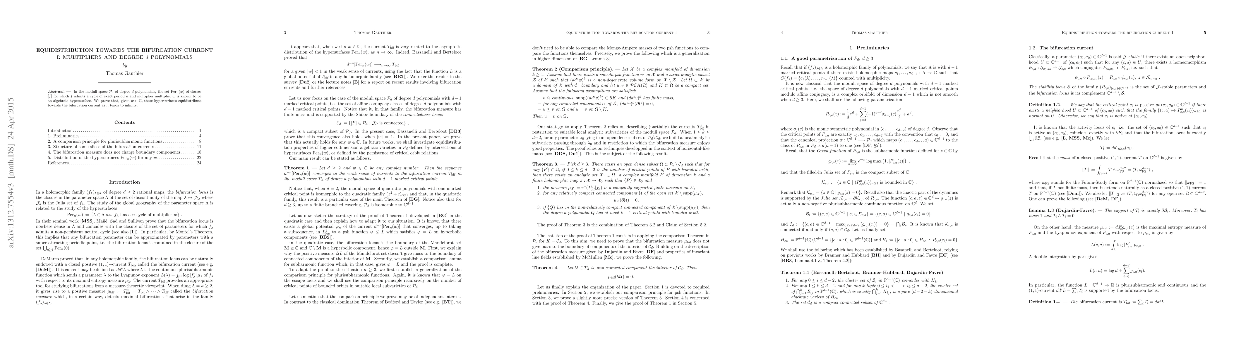 This research proves that for complex number 'w', algebraic hypersurfaces in the moduli space of degree d polynomials, defined by cycles of exact period n and multiplier w, equidistribute towards the bifurcation current as period n approaches infinity.
