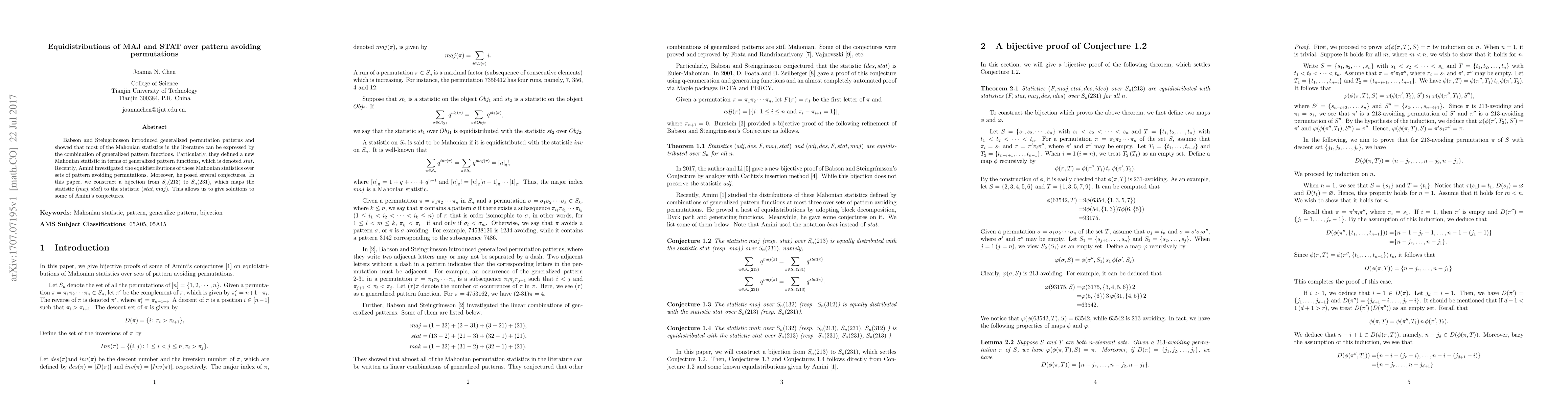 Babson and Steingr\'{\i}msson introduced generalized permutation patterns and showed that most of the Mahonian statistics in the literature can be expressed by the combination of generalized pattern functions. Particularly, they defined a new Mahonian statistic in terms of generalized pattern functions, which is denoted $stat$. Recently, Amini investigated the equidistributions of these Mahonian statistics over sets of pattern avoiding permutations. Moreover, he posed several conjectures. In this paper, we construct a bijection from $S_n(213)$ to $S_n(231)$, which maps the statistic $(maj,stat)$ to the statistic $(stat,maj)$. This allows us to give solutions to some of Amini's conjectures.