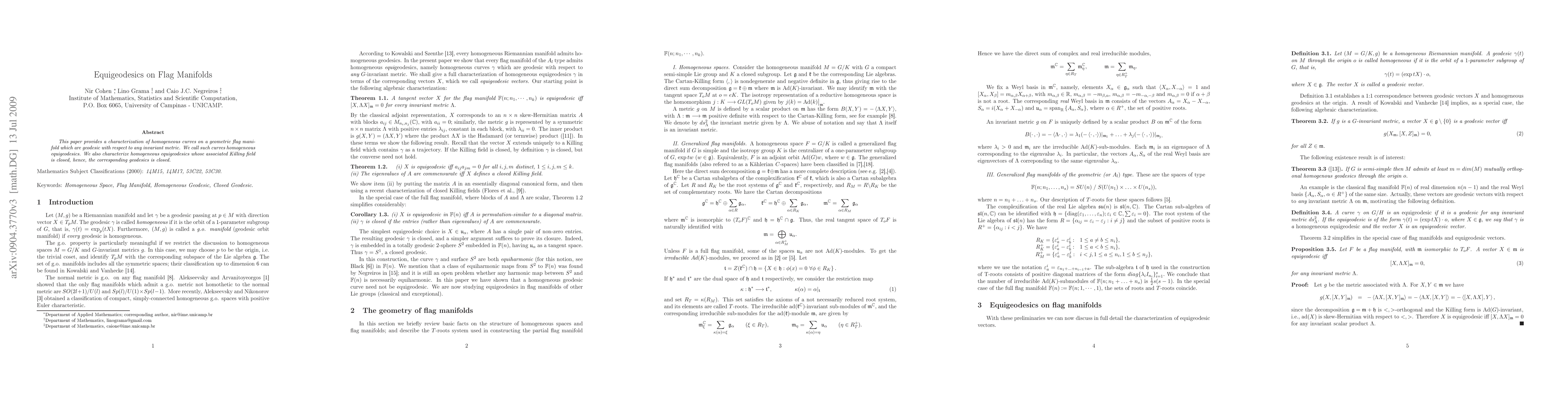 This paper characterizes homogeneous equigeodesics on geometric flag manifolds that remain geodesic under any invariant metric and identifies those with closed associated Killing fields, resulting in closed geodesics.