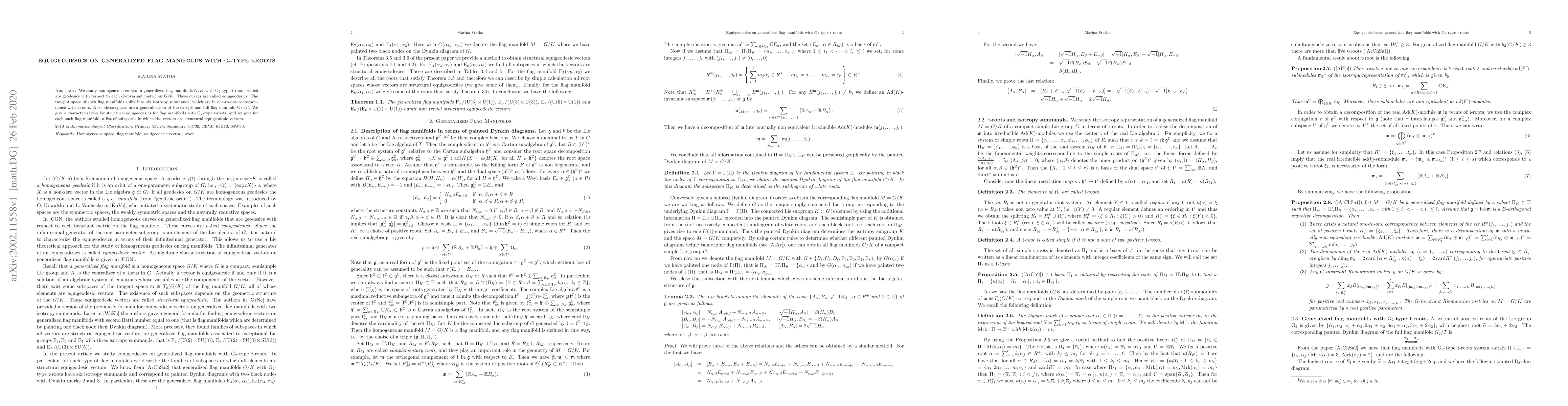 This paper characterizes equigeodesics on generalized flag manifolds with $G_2$-type $t$-roots, showing they are geodesics under any $G$-invariant metric. It identifies six isotropy summands corresponding to $t$-roots and provides a list of subspaces where vectors are structural equigeodesic vectors for these manifolds.
