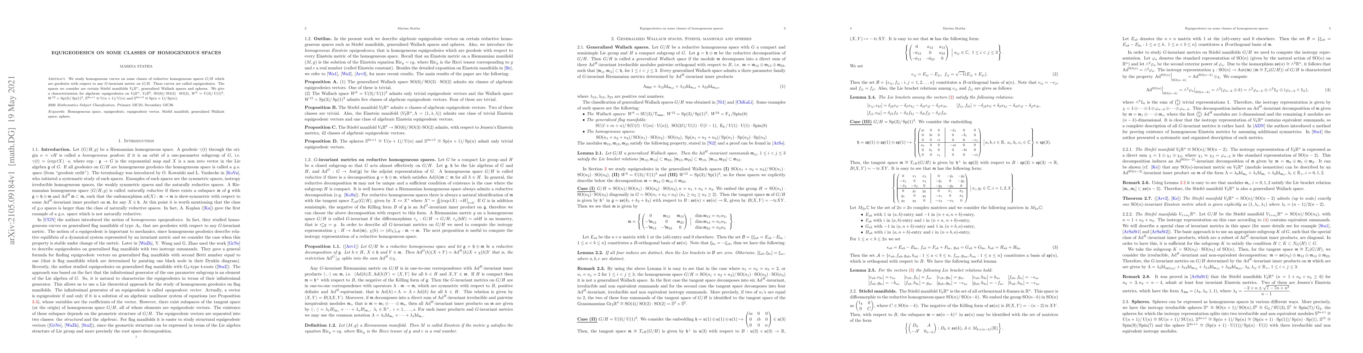 This paper investigates the concept of equigeodesics on various classes of reductive homogeneous spaces, specifically focusing on Stiefel manifolds, generalized Wallach spaces, and spheres. The authors provide a detailed characterization of algebraic equigeodesics for several specific homogeneous spaces, including V2Rn, V4R6, and others.