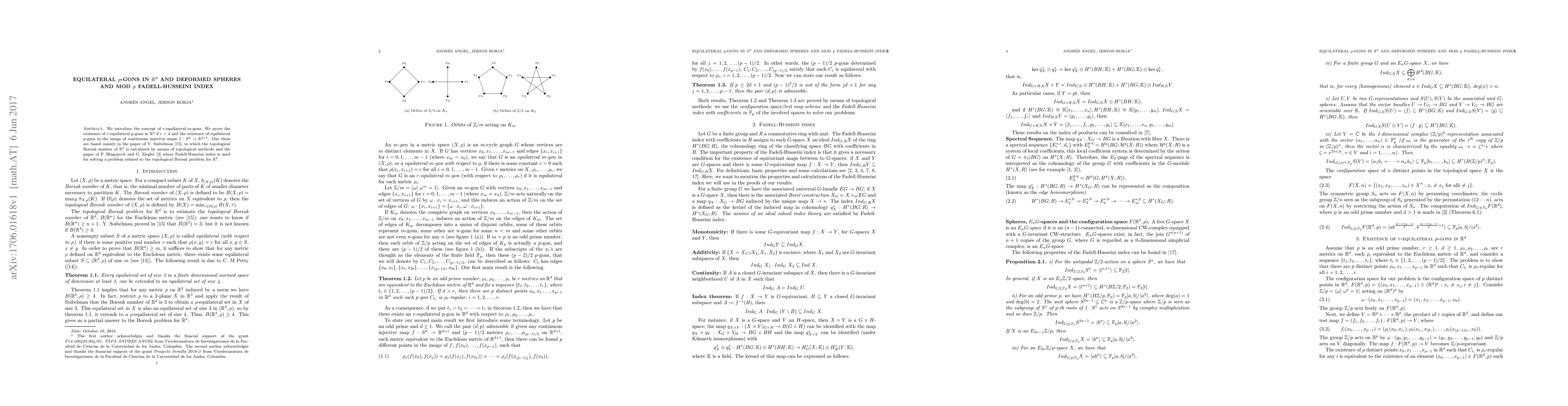 Researchers prove the existence of certain geometric shapes in high-dimensional spaces, including equilateral p-gons in R^d, using topological methods and Fadell-Husseini index.