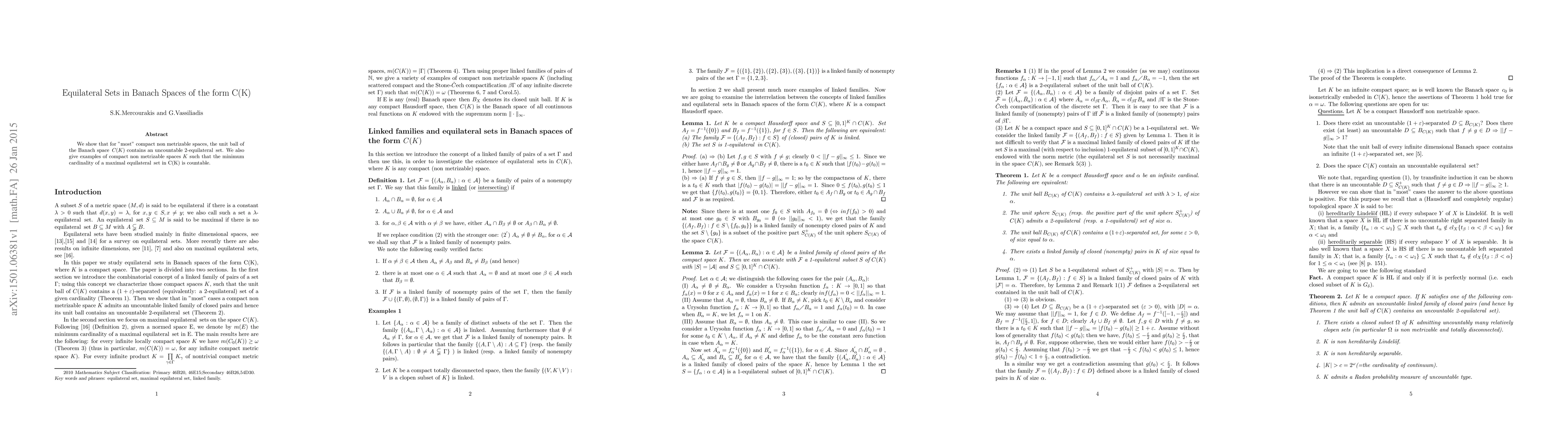 Summary: The paper demonstrates that the unit ball of Banach spaces C(K) for most compact non metrizable spaces contains an uncountable 2-equilateral set, while also providing examples where the smallest maximal equilateral set in C(K) has countable cardinality.