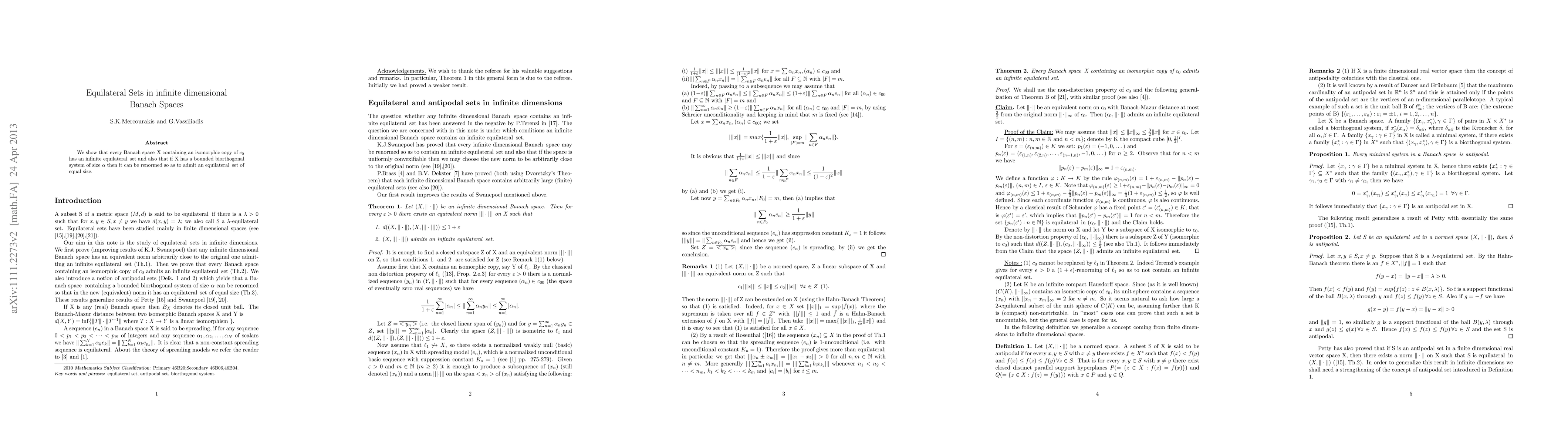 Summary: The paper demonstrates the existence of infinite equilateral sets in Banach spaces containing $c_0$ and shows that Banach spaces with bounded biorthogonal systems can be renormed to accommodate equilateral sets of matching size. Additionally, under specific combinatorial conditions, $C(K)$ spaces for compact non-metrizable spaces $K$ possess uncountable equilateral sets.