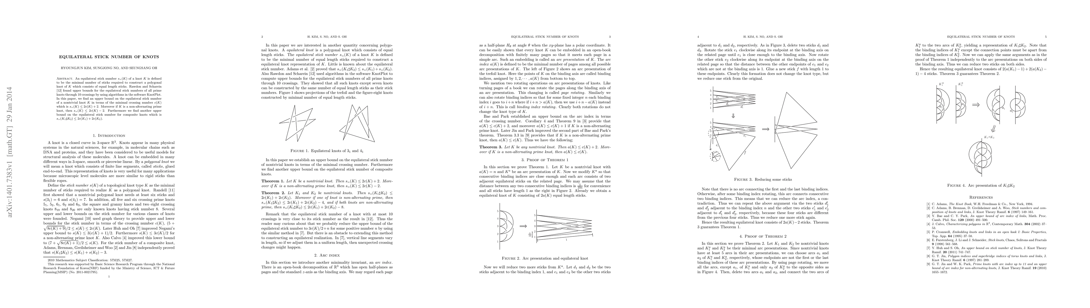 This paper establishes upper bounds for the equilateral stick number of knots, defined as the minimal number of equal-length sticks needed to construct a polygonal representation of a knot. The authors derive $s_{=}(K) \le 2c(K) + 2$ for nontrivial knots and $s_{=}(K) \le 2c(K) - 2$ for non-alternating prime knots.