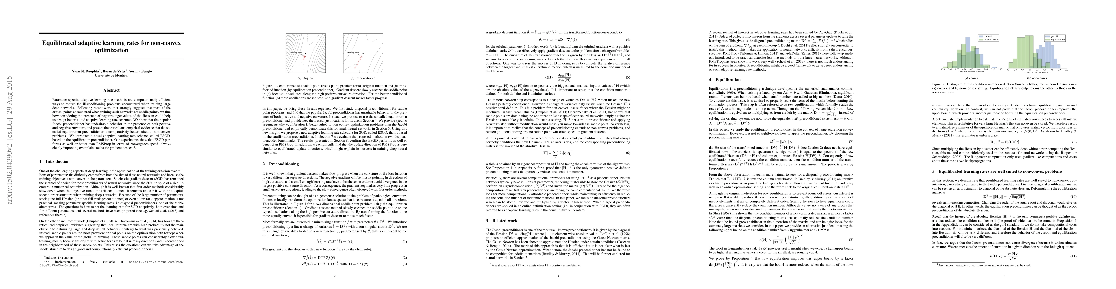 Researchers developed a novel adaptive learning rate scheme called ESGD, which outperforms RMSProp in convergence speed for non-convex optimization problems, leveraging equilibration preconditioning to handle saddle points.