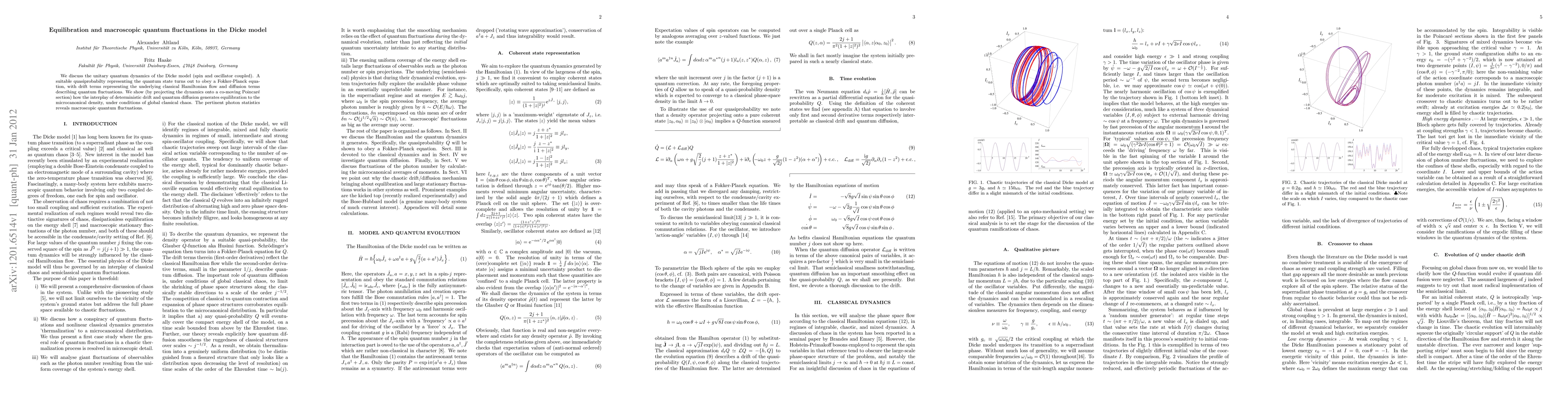 We discuss the unitary quantum dynamics of the Dicke model (spin and oscillator coupled). A suitable quasiprobabilty representing the quantum state turns out to obey a Fokker-Planck equation, with drift terms representing the underlying classical Hamiltonian flow and diffusion terms describing quantum fluctuations. We show (by projecting the dynamics onto a co-moving Poincar\'e section) how the interplay of deterministic drift and quantum diffusion generates equilibration to the microcanonical density, under conditions of global classical chaos. The pertinent photon statistics reveals macroscopic quantum fluctuations.