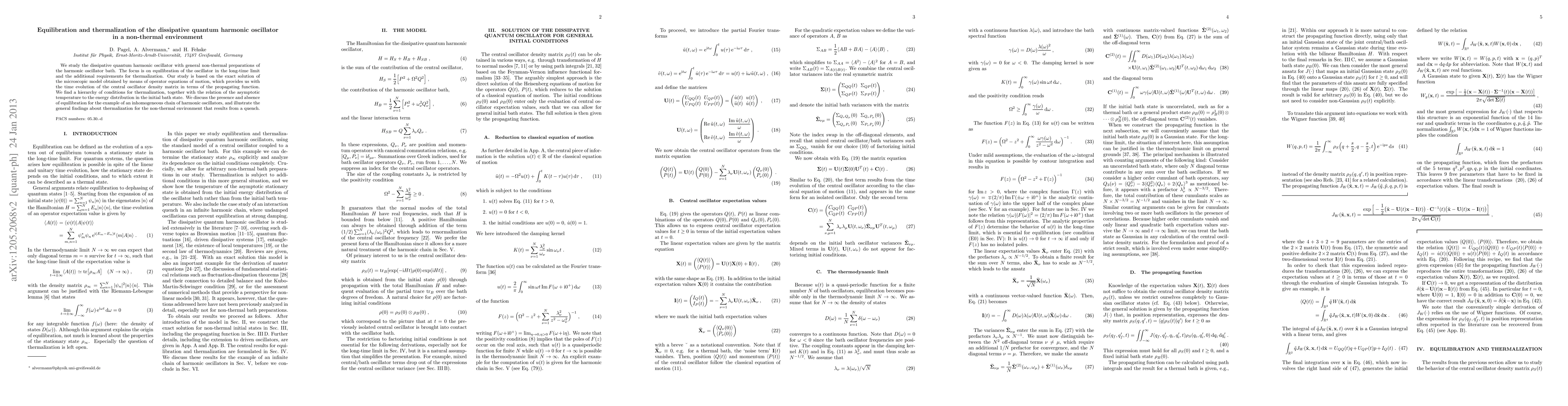 This paper investigates the equilibration and thermalization of a dissipative quantum harmonic oscillator in non-thermal environments, using exact solutions derived from operator equations of motion. It identifies conditions for thermalization and discusses the impact of initial bath state energy distribution on the asymptotic temperature.