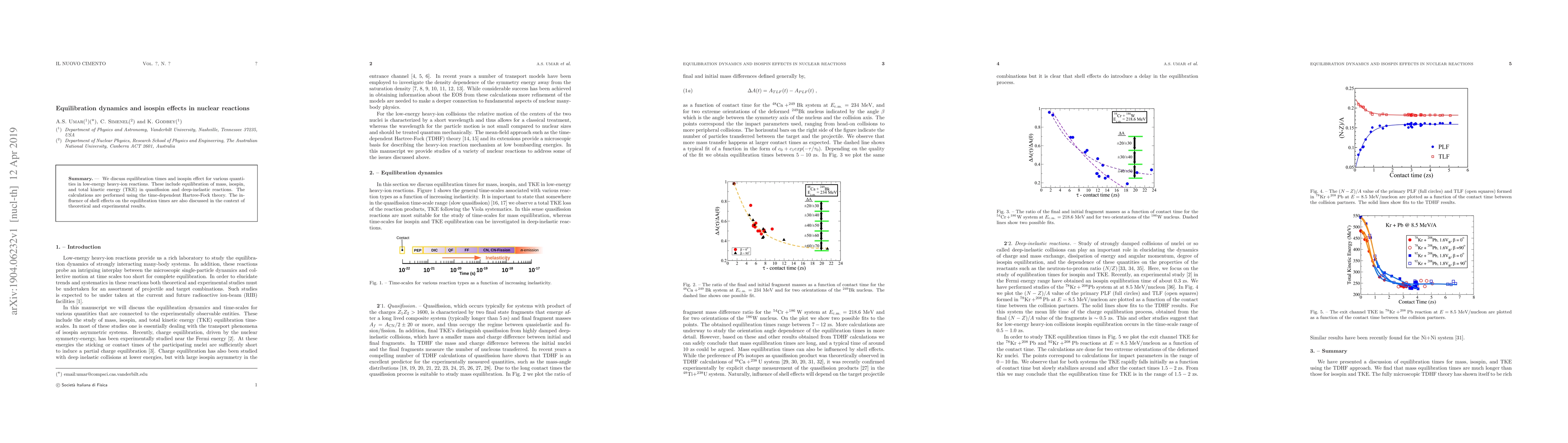 We discuss equilibration times and isospin effect for various quantities in low-energy heavy-ion reactions. These include equilibration of mass, isospin, and total kinetic energy (TKE) in quasifission and deep-inelastic reactions. The calculations are performed using the time-dependent Hartree-Fock theory. The influence of shell effects on the equilibration times are also discussed in the context of theoretical and experimental results.