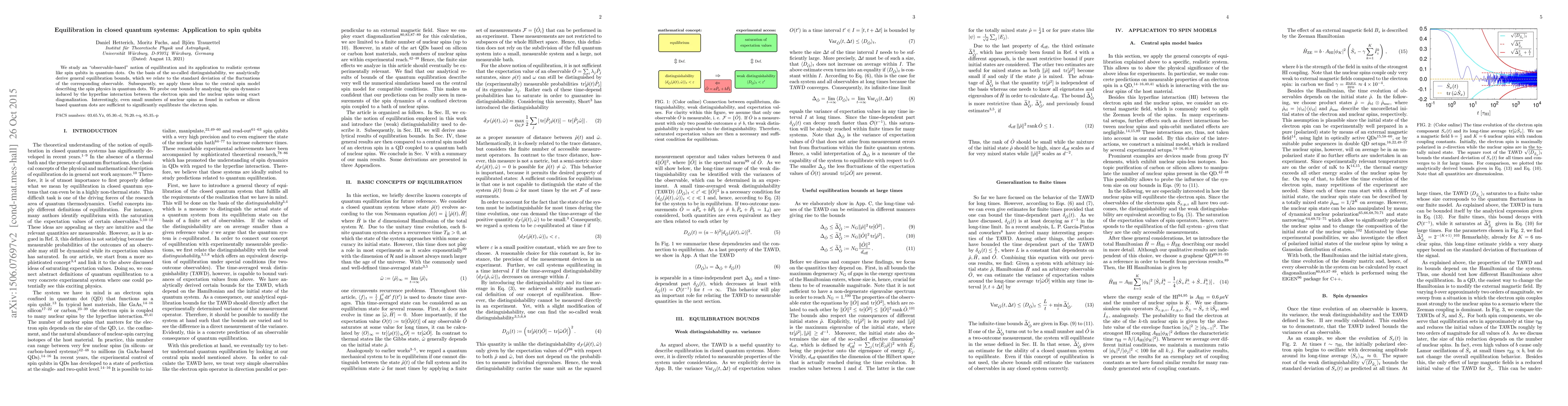 We study an observable-based notion of equilibration and its application to realistic systems like spin qubits in quantum dots. On the basis of the so-called distinguishability, we analytically derive general equilibration bounds, which we relate to the standard deviation of the fluctuations of the corresponding observable. Subsequently, we apply these ideas to the central spin model describing the spin physics in quantum dots. We probe our bounds by analyzing the spin dynamics induced by the hyperfine interaction between the electron spin and the nuclear spins using exact diagonalization. Interestingly, even small numbers of nuclear spins as found in carbon or silicon based quantum dots are sufficient to significantly equilibrate the electron spin.
