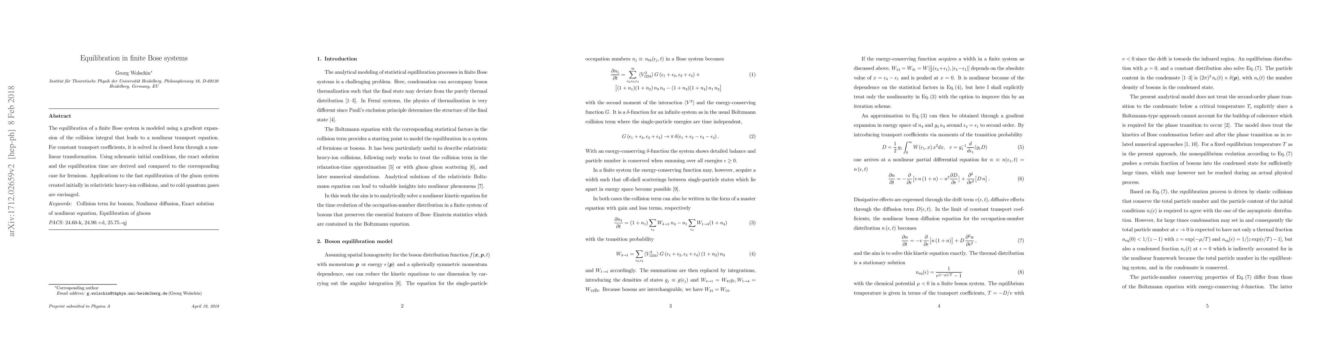 This paper models the equilibration process in finite Bose systems using a gradient expansion of the collision integral, deriving a nonlinear transport equation and solving it for constant transport coefficients. It compares the equilibration dynamics and time scales with those of fermions, with applications to gluon systems in relativistic heavy-ion collisions and cold quantum gases.