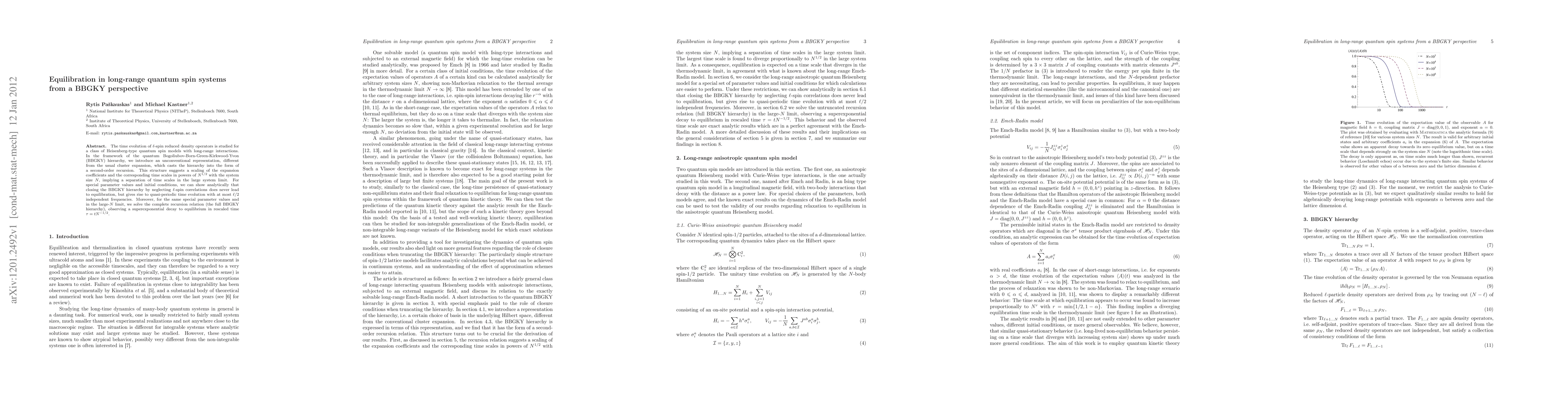 The time evolution of $\ell$-spin reduced density operators is studied for a class of Heisenberg-type quantum spin models with long-range interactions. In the framework of the quantum Bogoliubov-Born-Green-Kirkwood-Yvon (BBGKY) hierarchy, we introduce an unconventional representation, different from the usual cluster expansion, which casts the hierarchy into the form of a second-order recursion. This structure suggests a scaling of the expansion coefficients and the corresponding time scales in powers of $N^{1/2}$ with the system size $N$, implying a separation of time scales in the large system limit. For special parameter values and initial conditions, we can show analytically that closing the BBGKY hierarchy by neglecting $\ell$-spin correlations does never lead to equilibration, but gives rise to quasi-periodic time evolution with at most $\ell/2$ independent frequencies. Moreover, for the same special parameter values and in the large-$N$ limit, we solve the complete recursion relation (the full BBGKY hierarchy), observing a superexponential decay to equilibrium in rescaled time $\tau=tN^{-1/2}$.