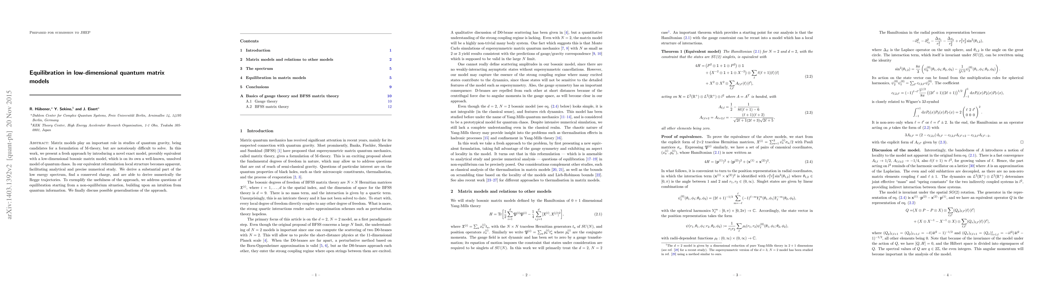 Matrix models play an important role in studies of quantum gravity, being candidates for a formulation of M-theory, but are notoriously difficult to solve. In this work, we present a fresh approach by introducing a novel exact model provably equivalent with low-dimensional bosonic matrix models. In this equivalent model significant local structure becomes apparent and it can serve as a simple toy model for analytical and precise numerical study. We derive a substantial part of the low energy spectrum, find a conserved charge, and are able to derive numerically the Regge trajectories. To exemplify the usefulness of the approach, we address questions of equilibration starting from a non-equilibrium situation, building upon an intuition from quantum information. We finally discuss possible generalizations of the approach.