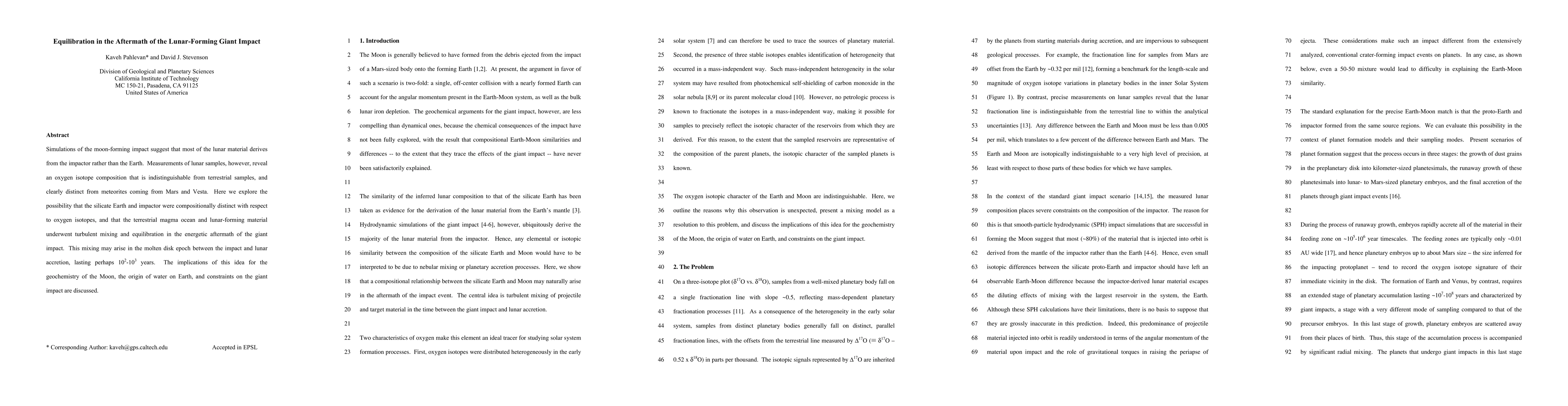 This paper explores how turbulent mixing and equilibration in the molten disk following the moon-forming impact could explain the similar oxygen isotope composition between lunar and terrestrial samples, despite most lunar material originating from the impactor. The findings have implications for lunar geochemistry, Earth's water origin, and the dynamics of the giant impact event.