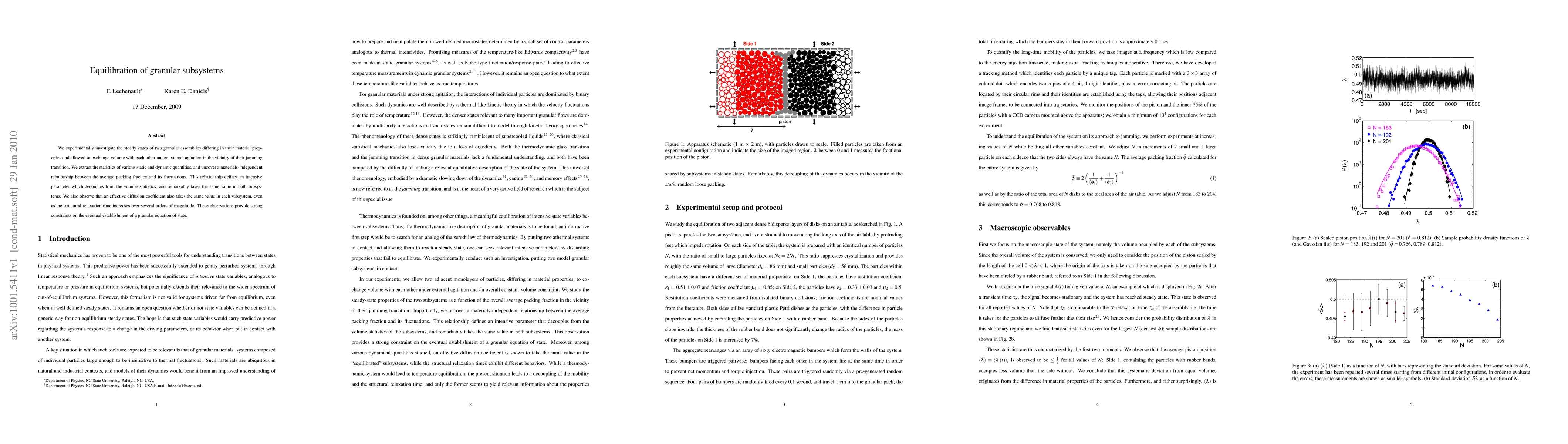 We experimentally investigate the steady states of two granular assemblies differing in their material properties and allowed to exchange volume with each other under external agitation in the vicinity of their jamming transition. We extract the statistics of various static and dynamic quantities, and uncover a materials-independent relationship between the average packing fraction and its fluctuations. This relationship defines an intensive parameter which decouples from the volume statistics, and remarkably takes the same value in both subsystems. We also observe that an effective diffusion coefficient also takes the same value in each subsystem, even as the structural relaxation time increases over several orders of magnitude. These observations provide strong constraints on the eventual establishment of a granular equation of state.