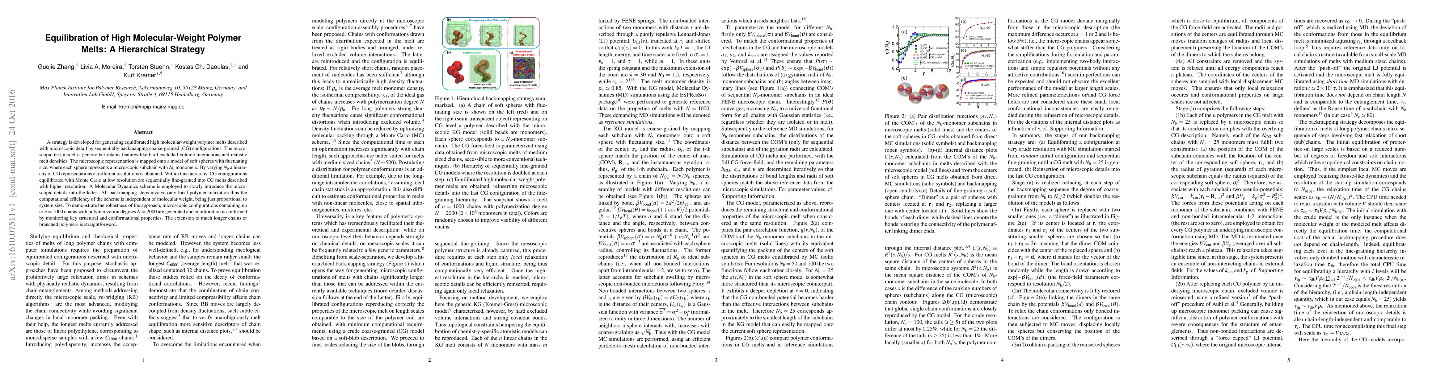 This research introduces a hierarchical strategy for generating equilibrated high molecular-weight polymer melts. It involves sequentially backmapping coarse-grained configurations to microscopic detail using a model of soft spheres. The method is computationally efficient, independent of molecular weight, and confirmed by equilibrating configurations with up to 1000 chains of 2000 monomers each.