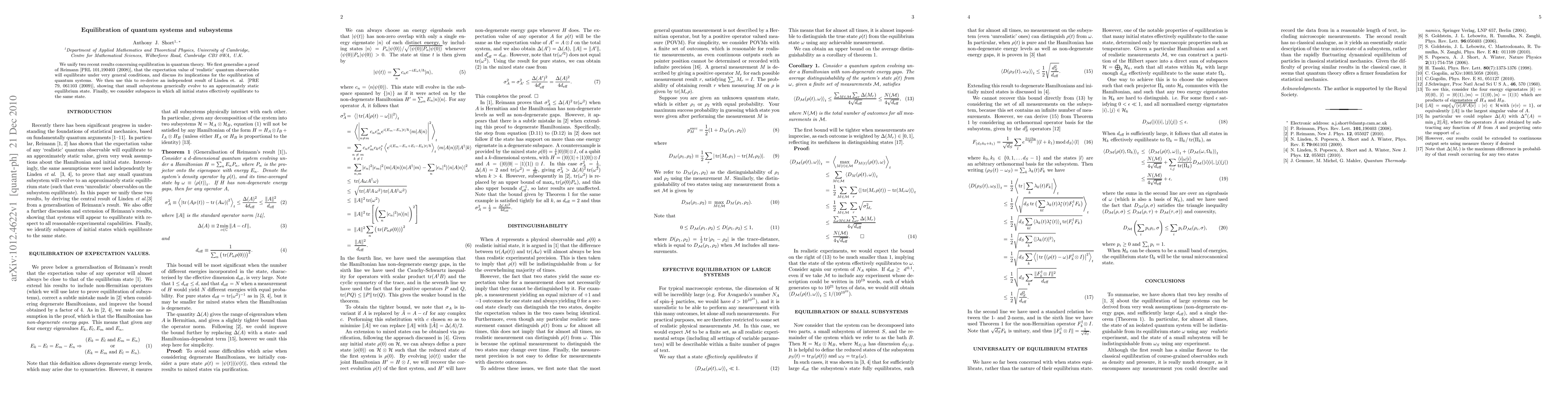 We unify two recent results concerning equilibration in quantum theory. We first generalise a proof of Reimann [PRL 101,190403 (2008)], that the expectation value of 'realistic' quantum observables will equilibrate under very general conditions, and discuss its implications for the equilibration of quantum systems. We then use this to re-derive an independent result of Linden et. al. [PRE 79, 061103 (2009)], showing that small subsystems generically evolve to an approximately static equilibrium state. Finally, we consider subspaces in which all initial states effectively equilibrate to the same state.