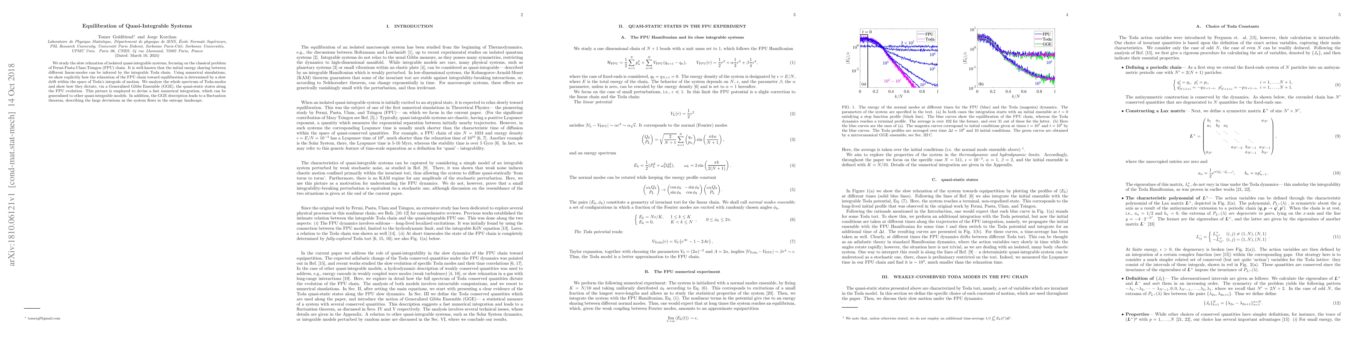 This paper investigates the relaxation dynamics of quasi-integrable systems, specifically the FPU chain, revealing how energy redistribution is governed by a slow drift in Toda's integrals of motion. The Generalized Gibbs Ensemble framework elucidates quasi-static states during the system's evolution, enabling a fast numerical integration method applicable to other quasi-integrable models.