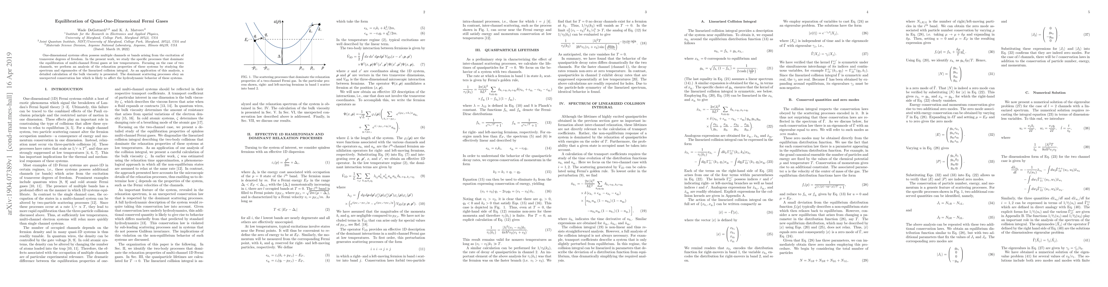 One-dimensional systems often possess multiple channels or bands arising from the excitation of transverse degrees of freedom. In the present work, we study the specific processes that dominate the equilibration of multi-channel Fermi gases at low temperatures. Focusing on the case of two channels, we perform an analysis of the relaxation properties of these systems by studying the spectrum and eigenmodes of the linearized collision integral. As an application of this analysis, a detailed calculation of the bulk viscosity is presented. The dominant scattering processes obey an unexpected conservation law which is likely to affect the hydrodynamic behavior of these systems.
