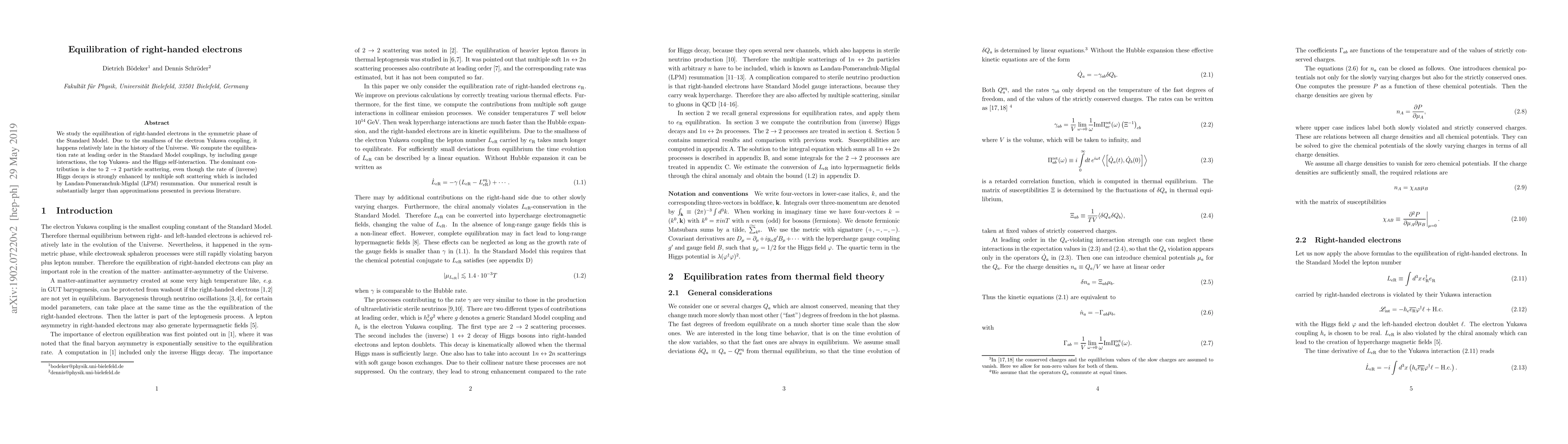 This paper investigates the equilibration of right-handed electrons in the Standard Model's symmetric phase, finding it occurs late due to the small electron Yukawa coupling. The study computes the equilibration rate, revealing a dominant contribution from $2 \to 2$ scattering, with significant enhancement from soft scattering effects via LPM resummation, resulting in a higher numerical rate than previous approximations.