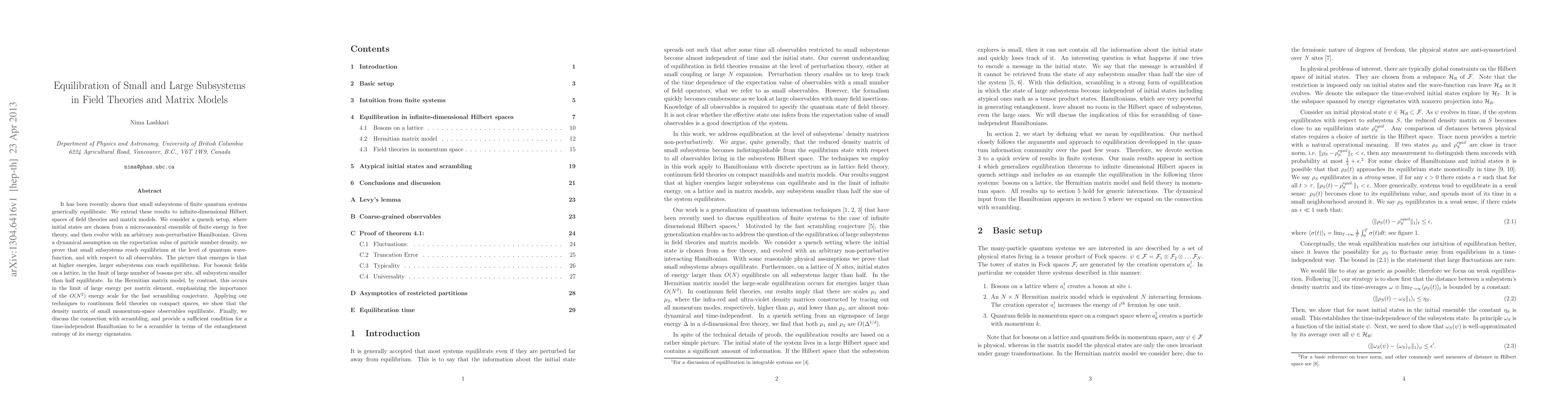 It has been recently shown that small subsystems of finite quantum systems generically equilibrate. We extend these results to infinite-dimensional Hilbert spaces of field theories and matrix models. We consider a quench setup, where initial states are chosen from a microcanonical ensemble of finite energy in free theory, and then evolve with an arbitrary non-perturbative Hamiltonian. Given a dynamical assumption on the expectation value of particle number density, we prove that small subsystems reach equilibrium at the level of quantum wave-function, and with respect to all observables. The picture that emerges is that at higher energies, larger subsystems can reach equilibrium. For bosonic fields on a lattice, in the limit of large number of bosons per site, all subsystem smaller than half equilibrate. In the Hermitian matrix model, by contrast, this occurs in the limit of large energy per matrix element, emphasizing the importance of the $O(N^2)$ energy scale for the fast scrambling conjecture. Applying our techniques to continuum field theories on compact spaces, we show that the density matrix of small momentum-space observables equilibrate. Finally, we discuss the connection with scrambling, and provide a sufficient condition for a time-independent Hamiltonian to be a scrambler in terms of the entanglement entropy of its energy eigenstates.