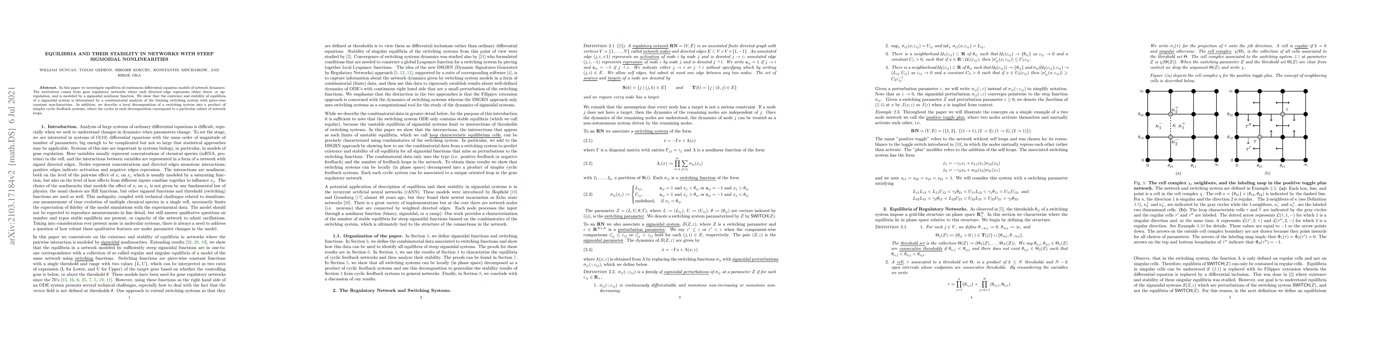 Researchers investigate how equilibria form and stabilize in complex networks with steep sigmoidal nonlinearities, a key feature of gene regulatory networks. They find that equilibrium stability depends on the network's structure and can be analyzed using combinatorial methods.