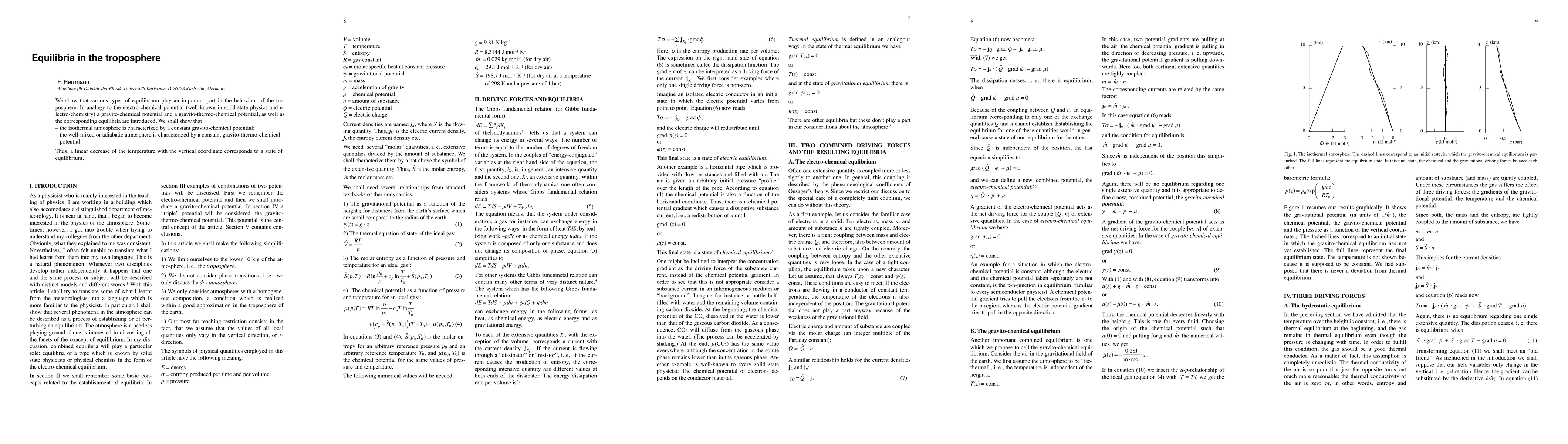 We show that various types of equilibrium play an important part in the behaviour of the troposphere. In analogy to the electro-chemical potential (well-known in solid-state physics and electro-chemistry) a gravito-chemical potential and a gravito-thermo-chemical potential, as well as the corresponding equilibria are introduced. We shall show that (a) the isothermal atmosphere is characterized by a constant gravito-chemical potential; (b) the well-mixed or adiabatic atmosphere is characterized by a constant gravito-thermo-chemical potential. Thus, a linear decrease of the temperature with the vertical coordinate corresponds to a state of equilibrium.
