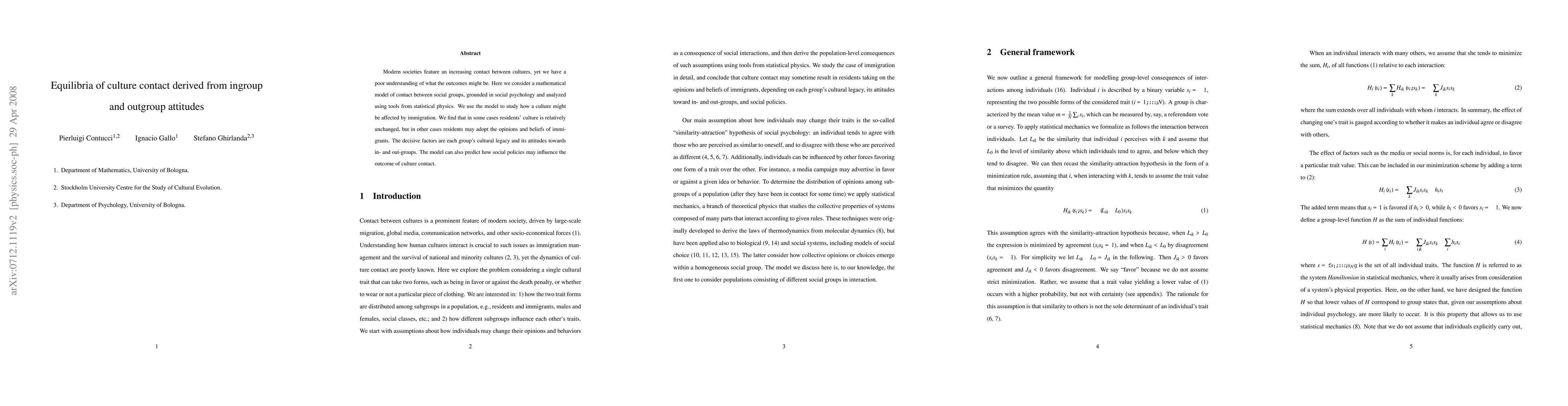 This paper develops a mathematical model to analyze culture contact outcomes based on ingroup and outgroup attitudes, finding that residents' cultural changes depend on their cultural legacy and attitudes, with social policies potentially influencing these dynamics.