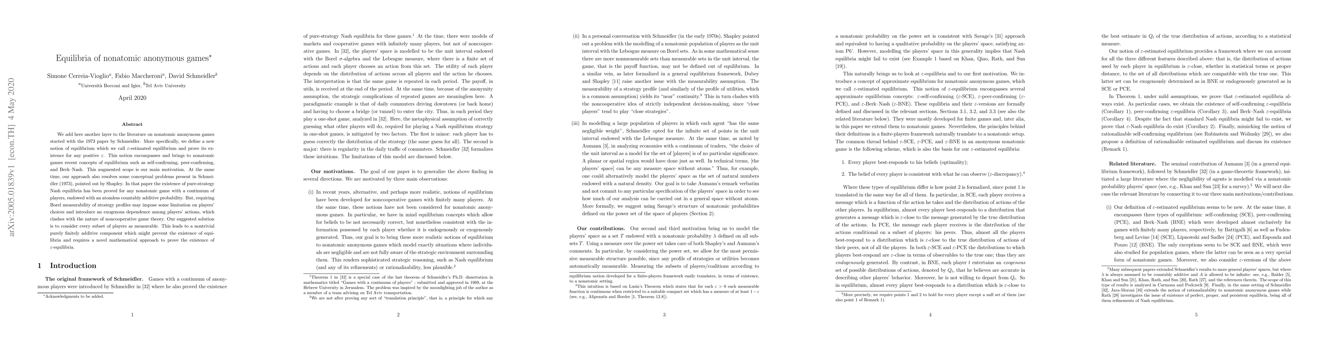 We add here another layer to the literature on nonatomic anonymous games started with the 1973 paper by Schmeidler. More specifically, we define a new notion of equilibrium which we call $\varepsilon$-estimated equilibrium and prove its existence for any positive $\varepsilon$. This notion encompasses and brings to nonatomic games recent concepts of equilibrium such as self-confirming, peer-confirming, and Berk--Nash. This augmented scope is our main motivation. At the same time, our approach also resolves some conceptual problems present in Schmeidler (1973), pointed out by Shapley. In that paper\ the existence of pure-strategy Nash equilibria has been proved for any nonatomic game with a continuum of players, endowed with an atomless countably additive probability. But, requiring Borel measurability of strategy profiles may impose some limitation on players' choices and introduce an exogenous dependence among\ players' actions, which clashes with the nature of noncooperative game theory. Our suggested solution is to consider every subset of players as measurable. This leads to a nontrivial purely finitely additive component which might prevent the existence of equilibria and requires a novel mathematical approach to prove the existence of $\varepsilon$-equilibria.