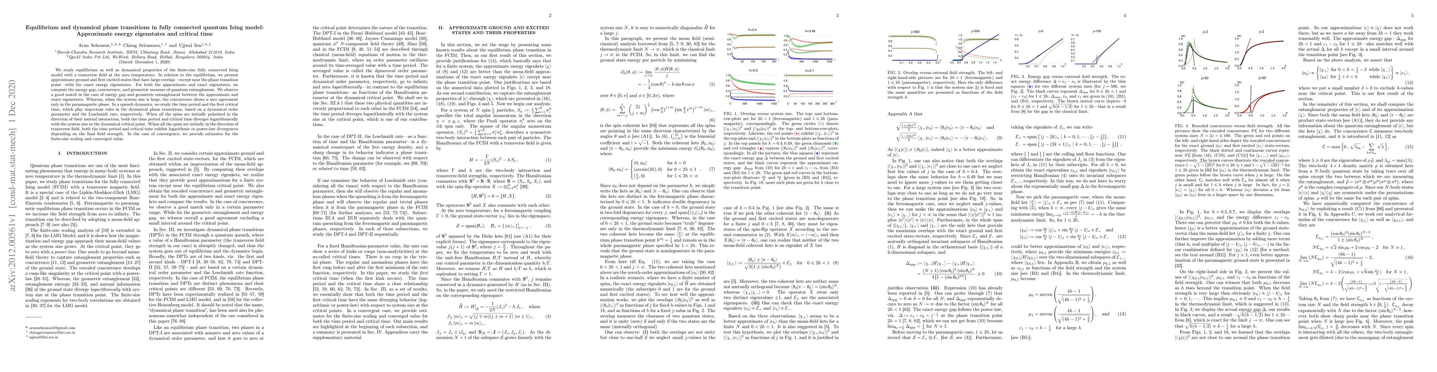 This study investigates equilibrium and dynamical phase transitions in a fully connected quantum Ising model, showing good matches between approximate and exact energy eigenstates for some properties, and logarithmic divergences in time-dependent quantities at the dynamical critical point.