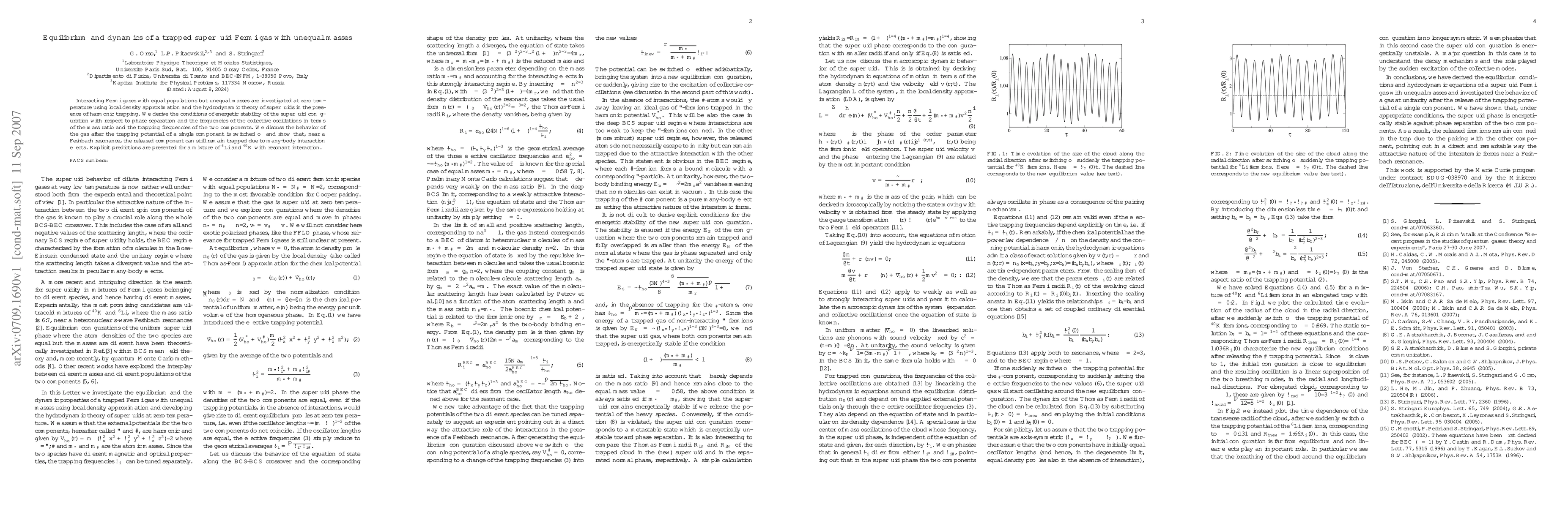 Interacting Fermi gases with equal populations but unequal masses are investigated at zero temperature using local density approximation and the hydrodynamic theory of superfluids in the presence of harmonic trapping. We derive the conditions of energetic stability of the superfluid configuration with respect to phase separation and the frequencies of the collective oscillations in terms of the mass ratio and the trapping frequencies of the two components. We discuss the behavior of the gas after the trapping potential of a single component is switched off and show that, near a Feshbach resonance, the released component can still remain trapped due to many-body interaction effects. Explicit predictions are presented for a mixture of $^6$Li and $^{40}$K with resonant interaction.