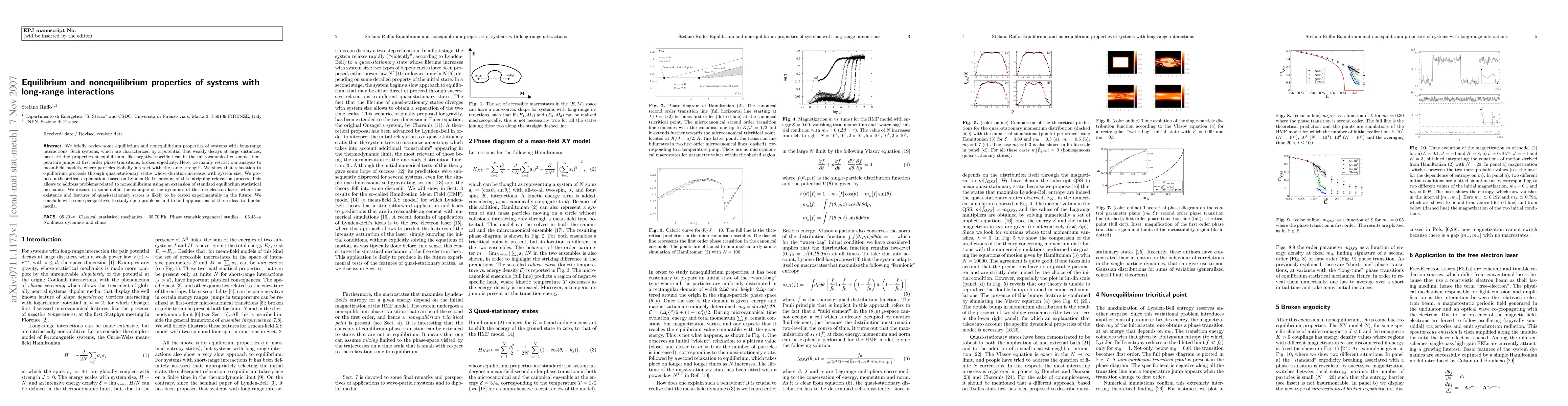 This paper reviews equilibrium and nonequilibrium properties of systems with long-range interactions, focusing on mean-field models. It highlights phenomena like negative specific heat and broken ergodicity, and proposes a theoretical explanation for the relaxation process through quasi-stationary states, with applications to the dynamics of free electron lasers.