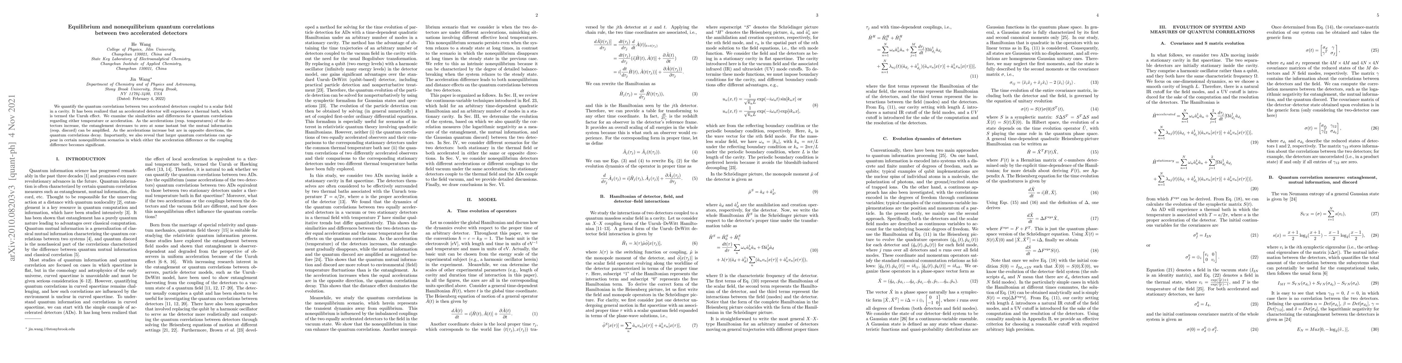 This paper investigates quantum correlations between two accelerated detectors interacting with a scalar field, highlighting how the Unruh effect influences entanglement and mutual information. It finds that while acceleration diminishes entanglement, it can enhance mutual information and discord, and that opposite accelerations reduce correlations, while nonequilibrium conditions can lead to increased quantum correlations.