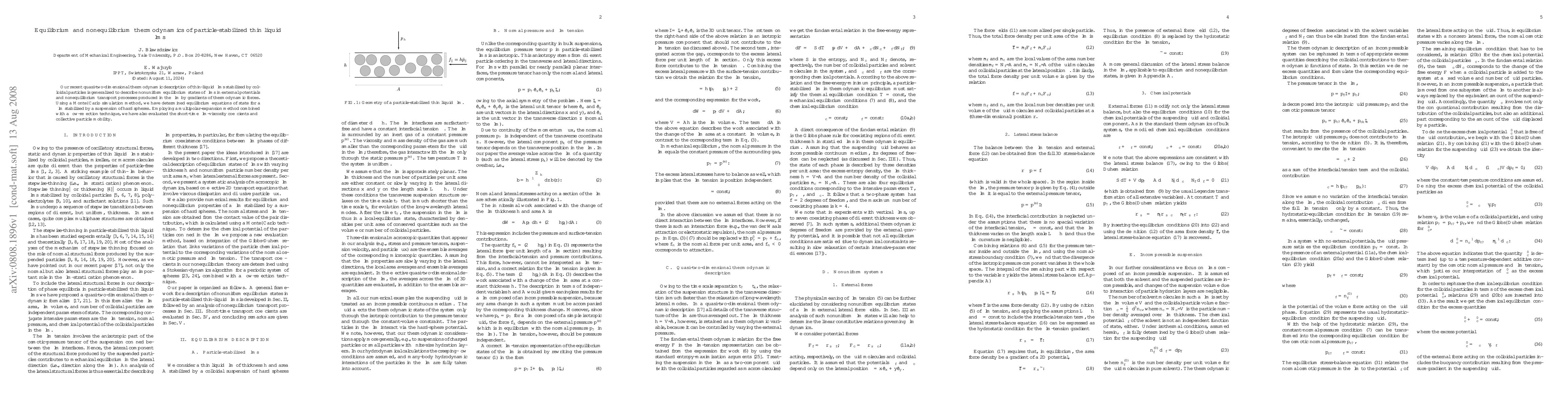 Our recent quasi-two-dimensional thermodynamic description of thin-liquid films stabilized by colloidal particles is generalized to describe nonuniform equilibrium states of films in external potentials and nonequilibrium transport processes produced in the film by gradients of thermodynamic forces. Using a Monte--Carlo simulation method, we have determined equilibrium equations of state for a film stabilized by a suspension of hard spheres. Employing a multipolar-expansion method combined with a flow-reflection technique, we have also evaluated the short-time film-viscosity coefficients and collective particle mobility.